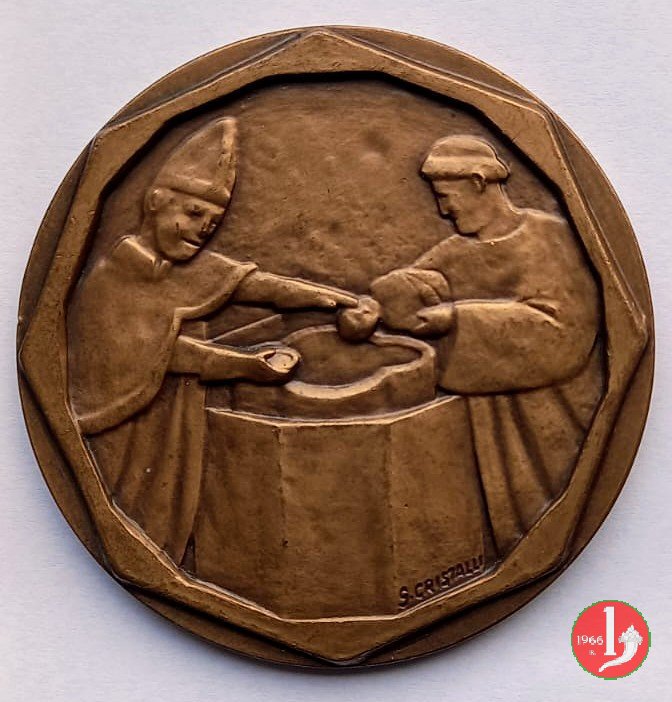 Dritto: Entro contorno ad imitazione della pianta del Battistero di Parma, ottagonale esterno ed eptadecagonale interno : Vescovo con mitra intento a battezzare bimbo retto da uomo con tonaca, entro la Vasca battesimale del Battistero