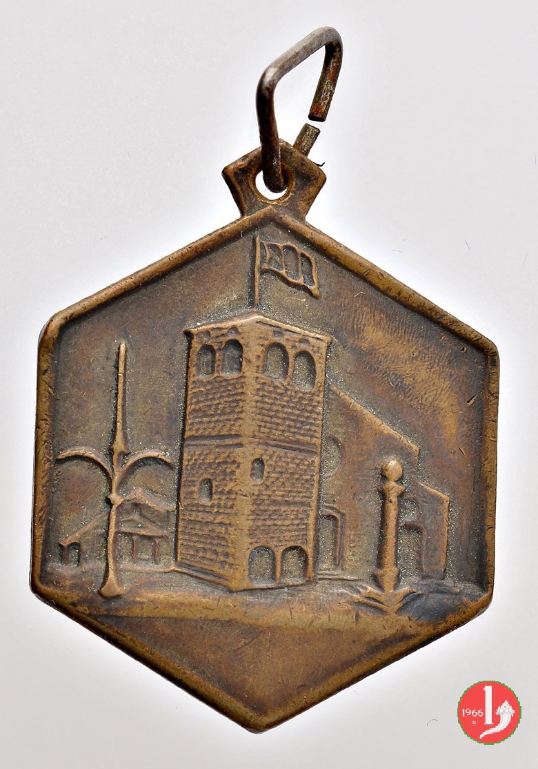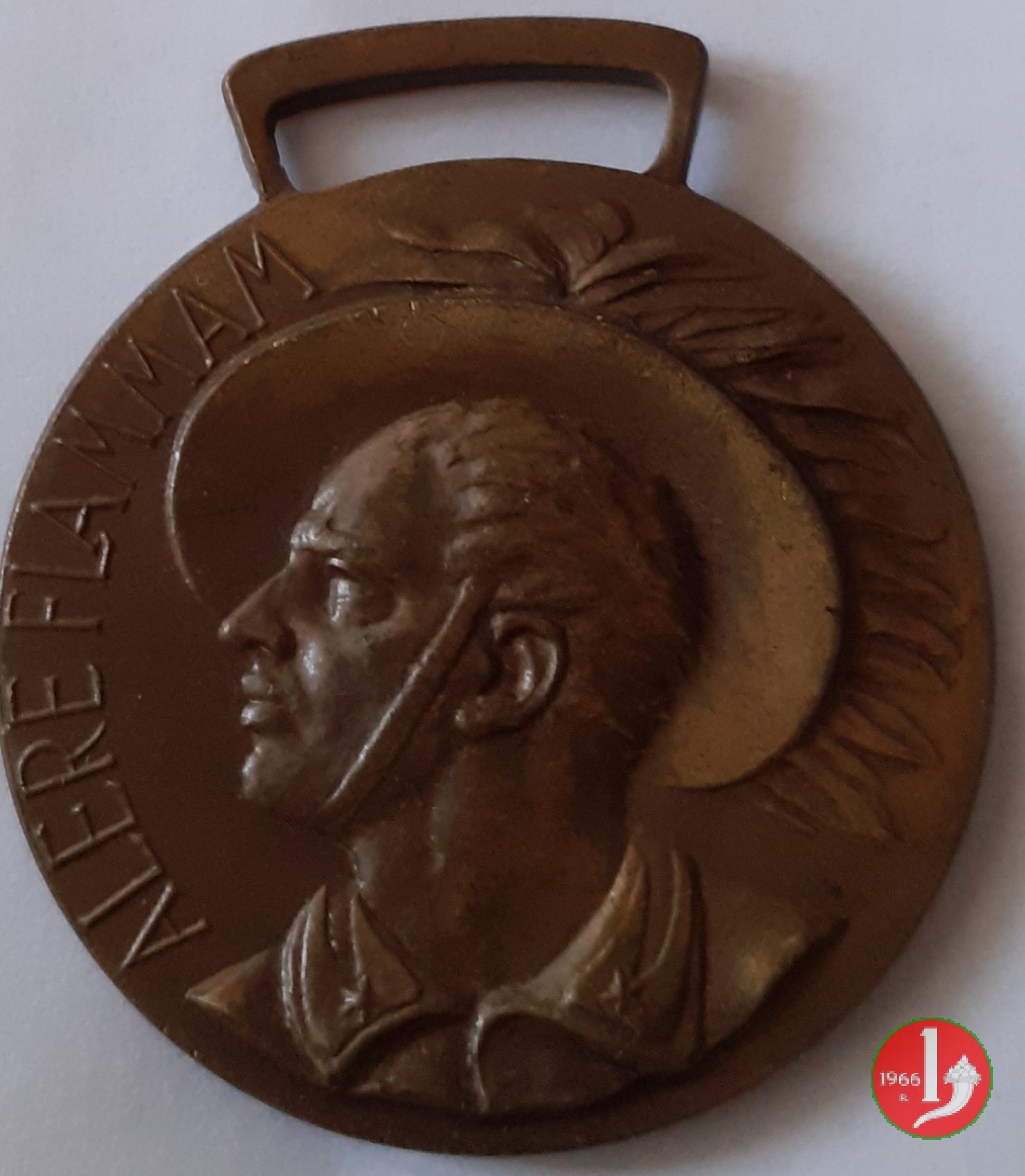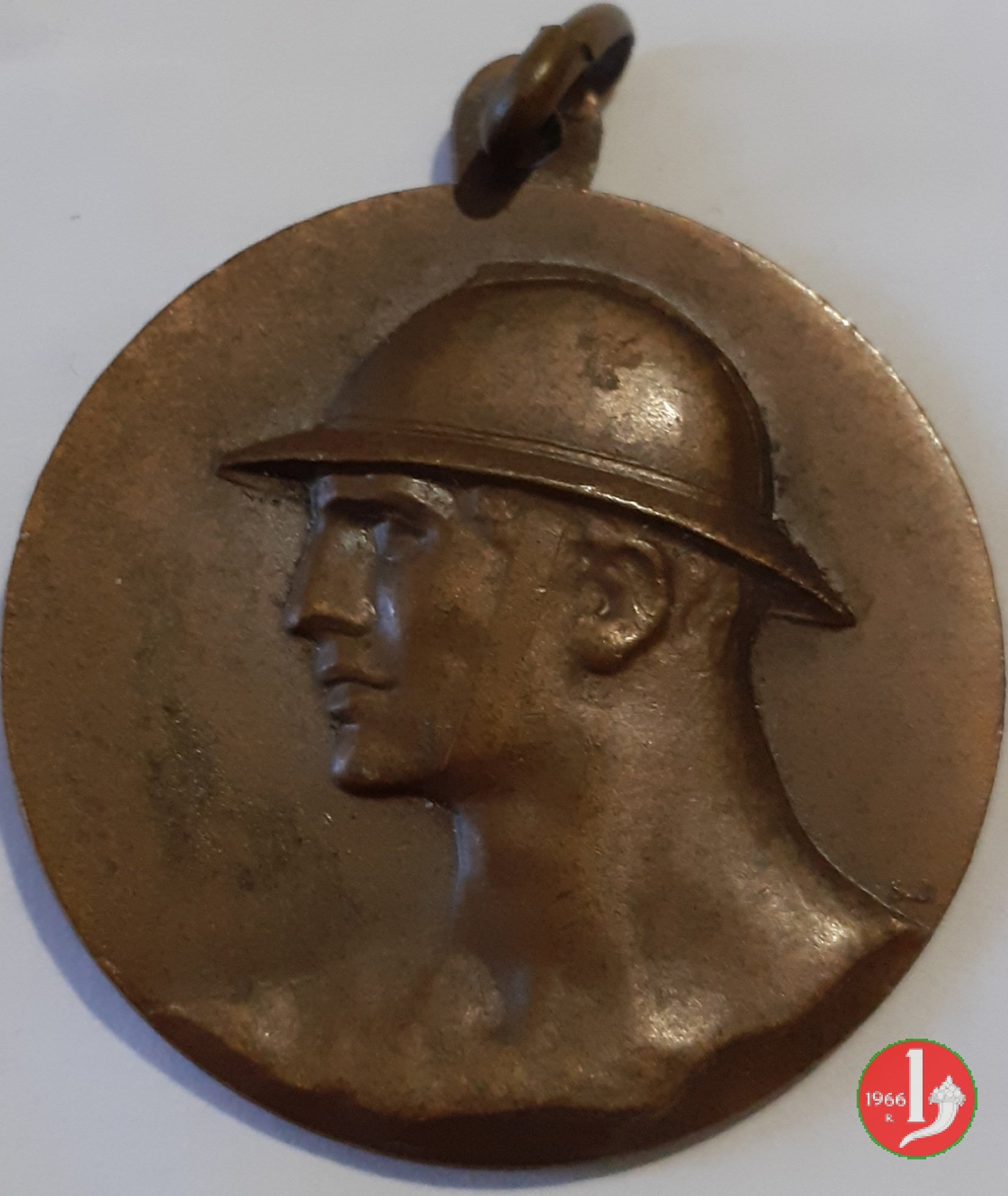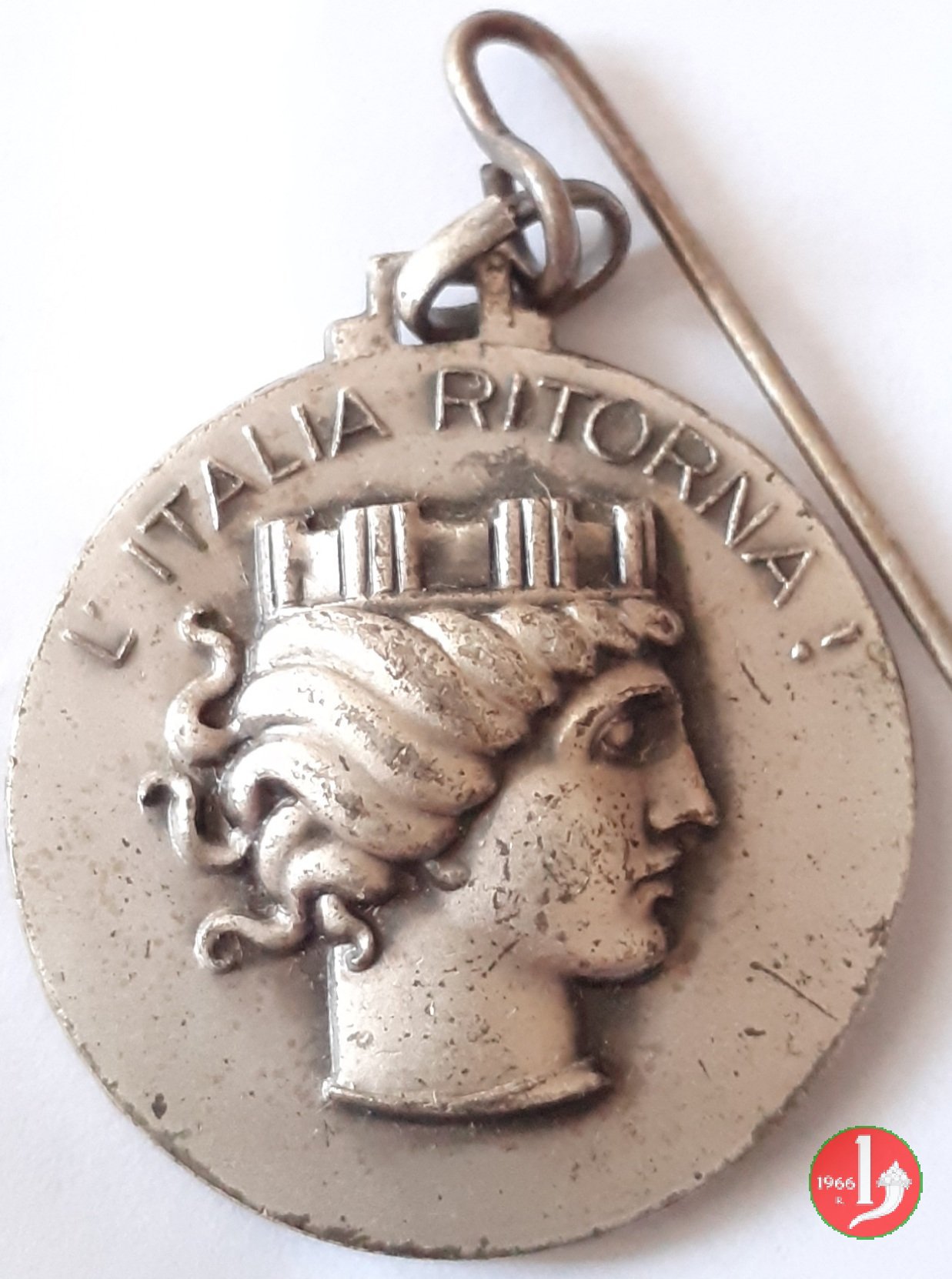 Dritto: entro medaglia fregiata ai lati da fregi di foglie: vista del Campanile di San Giusto con bandiera d'Italia alla sommità posto tra alabarda su edificio del ricreatorio a sx e la Cattedrale di San Giusto a dx