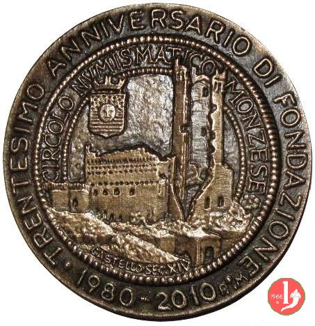 30° Circolo Numismatico Monzese 2010 Obverse: TRENTESIMO ANNIVERSARIO DI FONDAZIONE = • 1980 - 2010 • entro cerchio perlinato: CIRCOLO NUMISMATICO _ MONZESE * in alto, a sx: stemma medioevale del Comune di Monza immagine del Castello Visconteo di Monza in rovina in basso: CASTELLO SEC. XIV