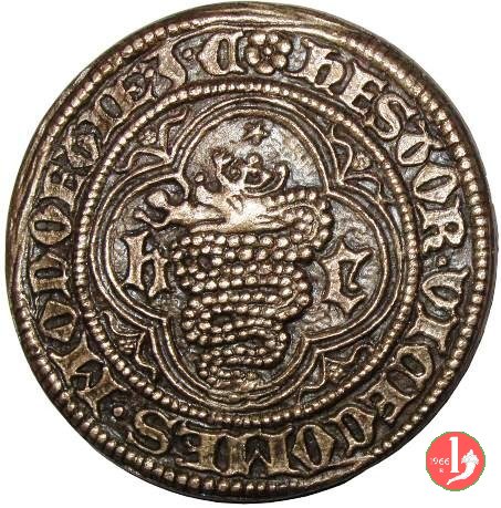 in basso, a dx: P.M. entro cerchio perlinato e in cornice quadrilobata, decorata con quattro fiori: biscione Visconteo che divora fanciullo, ai lati: H _ C |