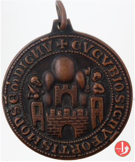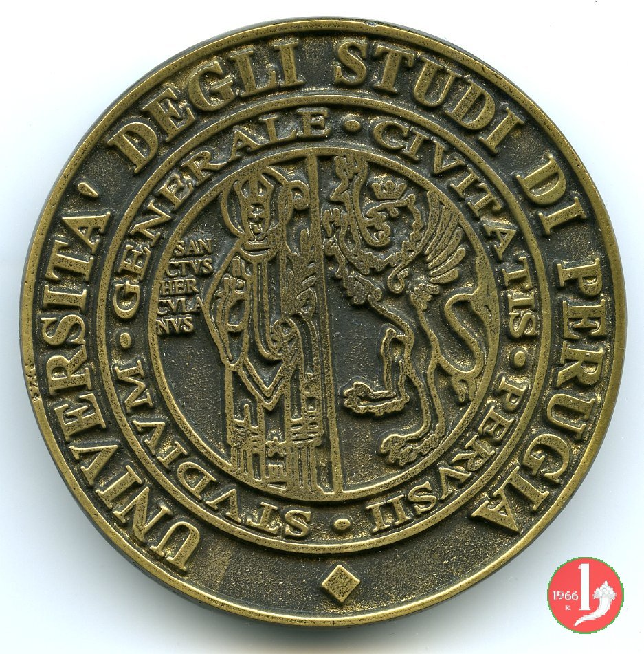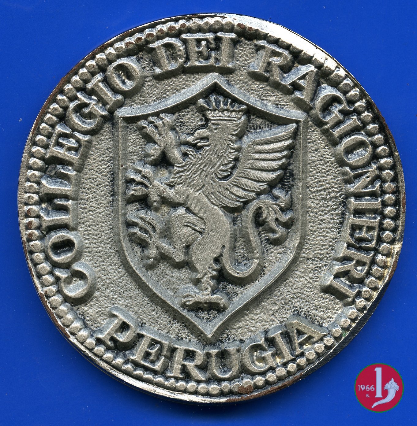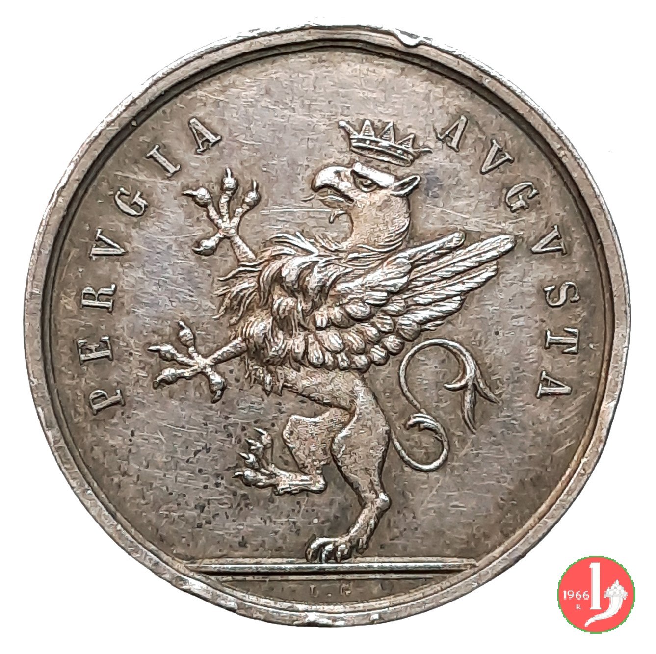 Dritto: la figura allegorica della città di Perugia seduta verso sx, protende serto d'alloro verso Palazzo dei Priori a sx e si appoggia a scudo con il grifone rampante