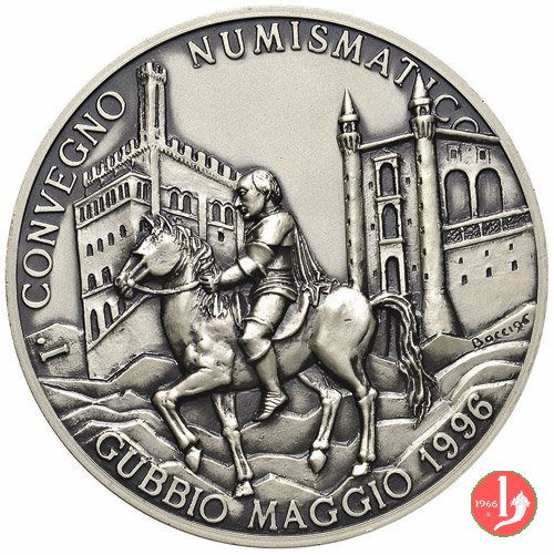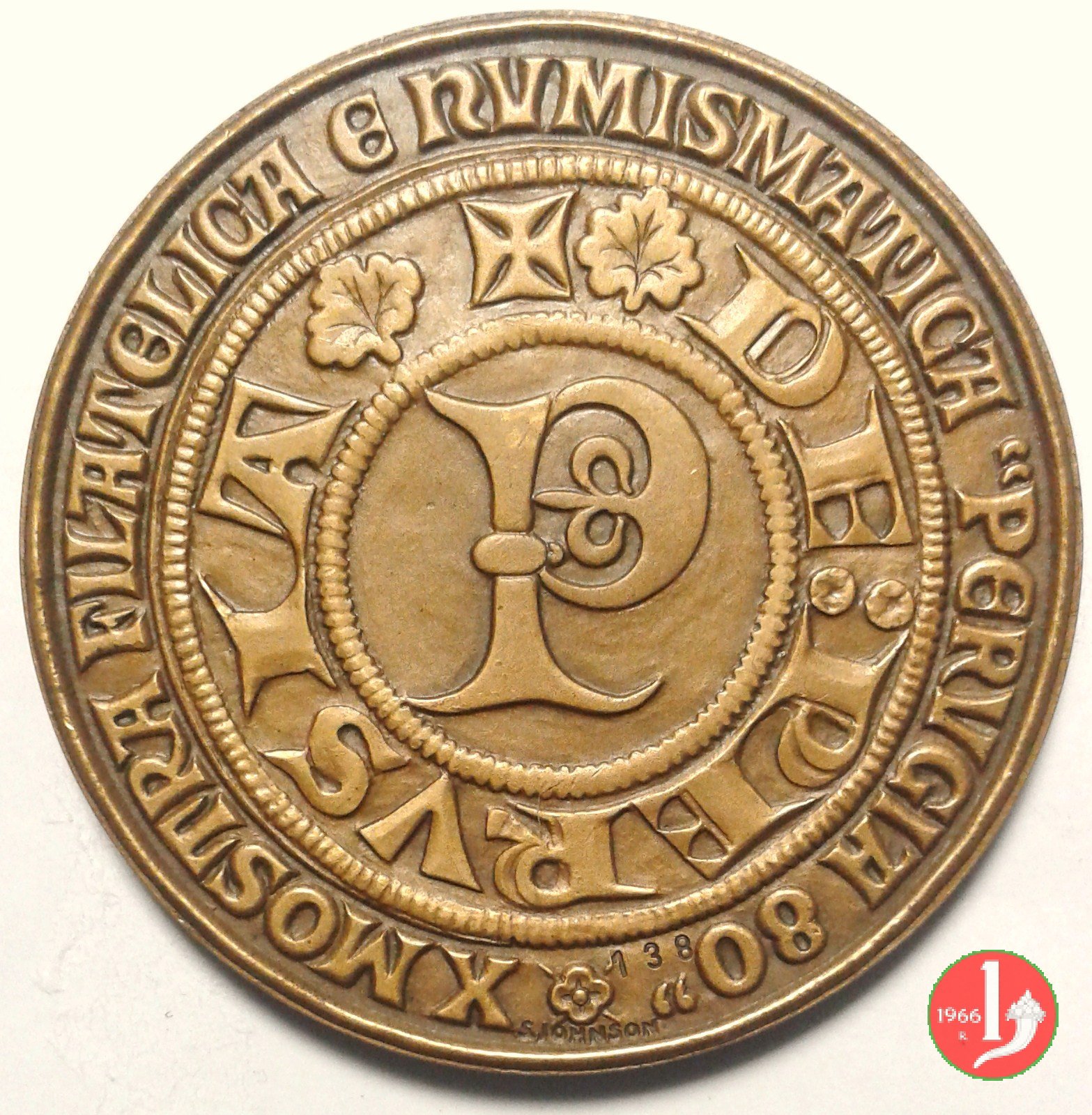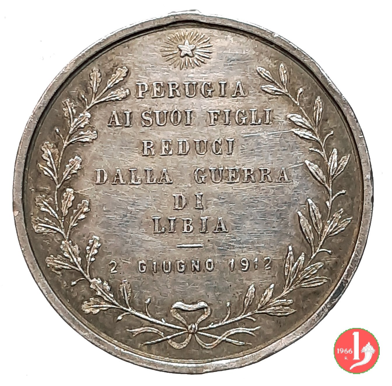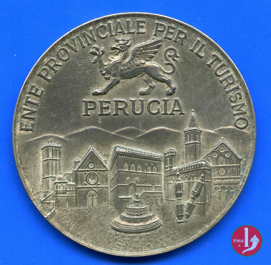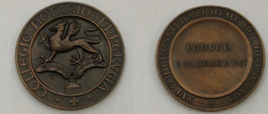 Dritto: la figura allegorica della città di Perugia seduta verso sx, protende serto d'alloro verso Palazzo dei Priori a sx e si appoggia a scudo con il grifone rampante