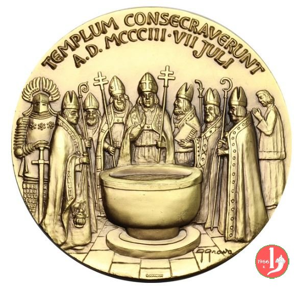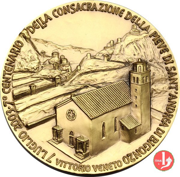 Pieve di Sant'Andrea di Bigonzo 2003 Dritto: TEMPLUM CONSECRAVERUNT = A.D. MCCCIII • VII JULI Vescovi con mitre e pastorali riuniti presso fonte battesimale in basso, a dx: G GRAVA in basso: JOHNSON vista della Pieve e sullo sfondo le fortificazioni di Serravalle |