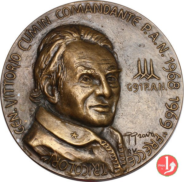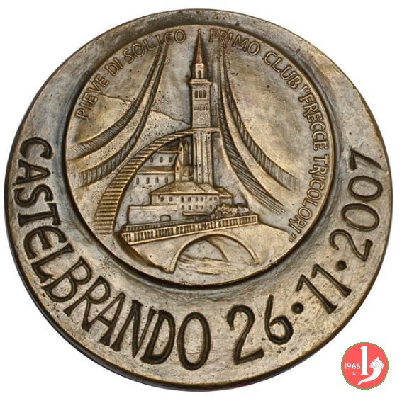 Pieve di Soligo - Club Frecce Tricolori 2007 Dritto: GEN. VITTORIO CUMIN COMANDANTE P.A.N. 1968 1969 "FRECCE TRICOLORI" busto di 3/4 a dx xon divisa nel campo a dx: logo delle Frecce Tricolori e sotto G91 P.A.N. in basso a dx: G GRAVA = RV entro medaglia: PIEVE DI SOLIGO _ PRIMO CLUB "FRECCE TRICOLORI" Vista di Pieve di Soligo con il Duomo e il Ponte sul Soligo |