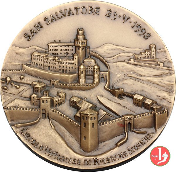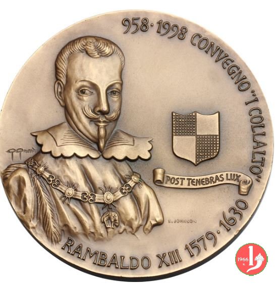 Convegno "I Collalto" - Vittorio Veneto 1998 Dritto: 958-1998 CONVEGNO "I COLLALTO" = RAMBALDO XIII 1579 • 1630 busto di fronte con collare del Toson d'oro nel campo a sx: G GRAVA nel campo a dx: Stemma Collalto e motto in nastro POST TENEBRAS LUX in basso a dx: JOHNSON Vista del castello di San Salvatore sotto circolarmente: CIRCOLO VITTORIESE DI RICERCHE STORICHE |