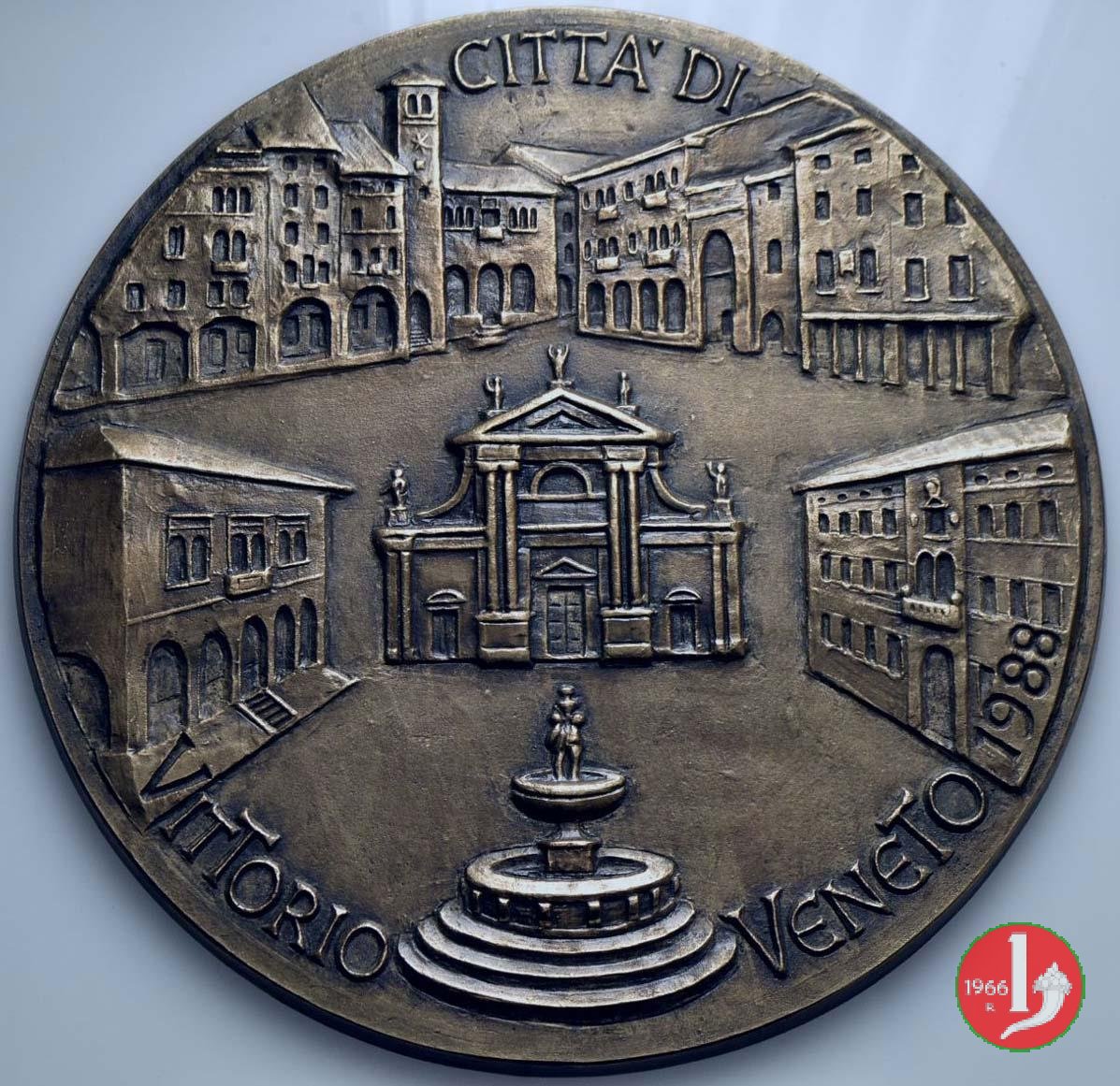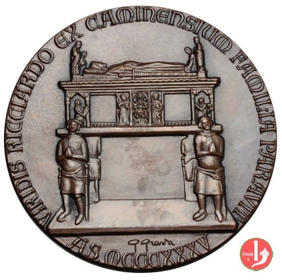 Convegno "Il Dominio dei Caminesi" - Vittorio Veneto 1985 Dritto: VIRDIS RICCIARDO EX CAMINENSIUM FAMILIA PARAVIT Prospetto anteriore del Monumento funebre di Rizzardo III da Camino in esergo: G GRAVA in esergo circolarmente: A.S. MCCCXXXV Stemma con cimiero e scudo sulla Vista del Castello in basso circolarmente: VITTORIO VENETO 1985 |