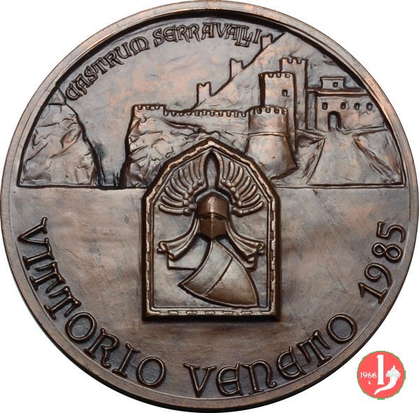 Castello di Serravalle - Vittorio Veneto 1985 Dritto: CASTRUM SERRAVALLI Vista del Castello di Serravalle al centro: Stemma con cimiero e scudetto in basso, circolarmente: VITTORIO VENETO 1985 Monumento sepolcrale di Rizzardo da Camino nella chiesa di Santa Giustina a Serravalle in esergo: GGRAVA in basso, circolarmente: A.S. MCCCXXXV | |