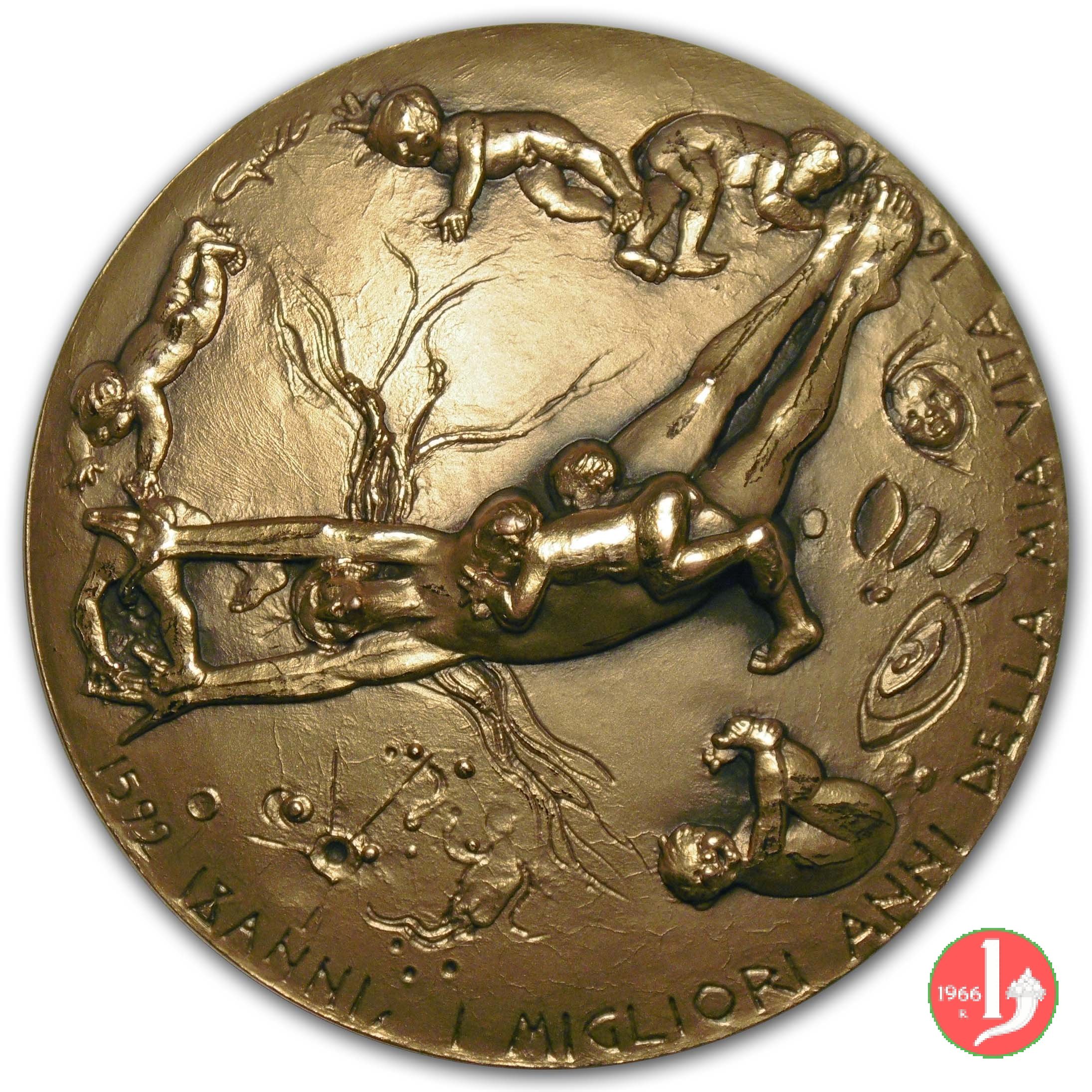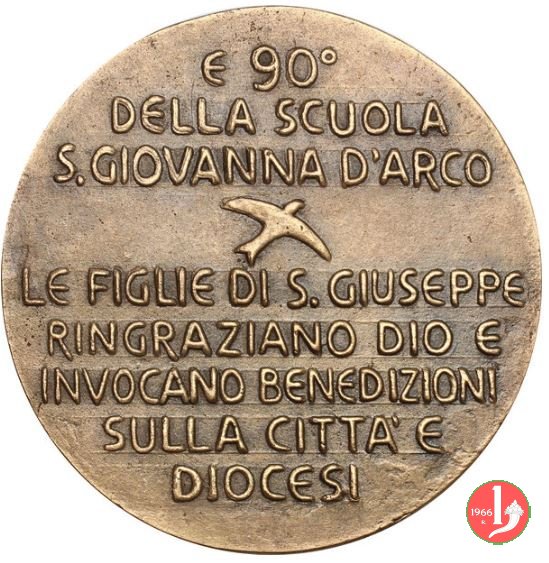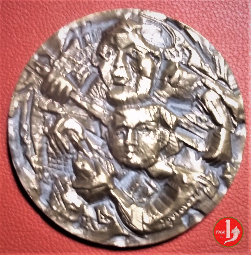 50° Cassa di Risparmio di Treviso 1963 Dritto: CASSA DI RISPARMIO DELLA MARCA TREVIGIANA Figura femminile velata, in piedi e volta a sx, regge scrigno aperto presso colonna decorata nel campo, a dx: Z in basso: G. MONASSI entro cerchio perlinato sormontato dallo Stemma della Città: vista del castello con nastro orizzontale su cui: TARVISIVM |