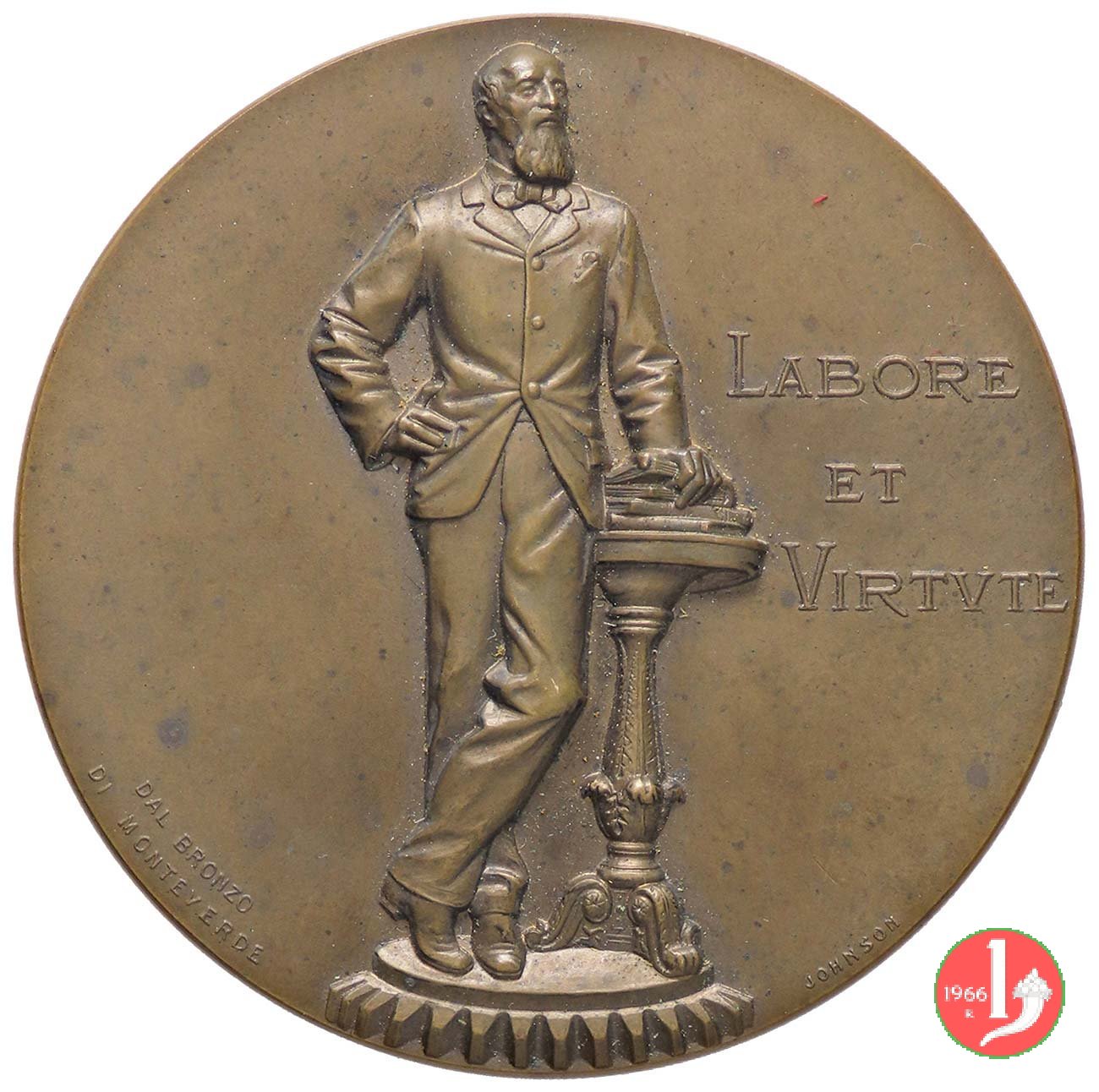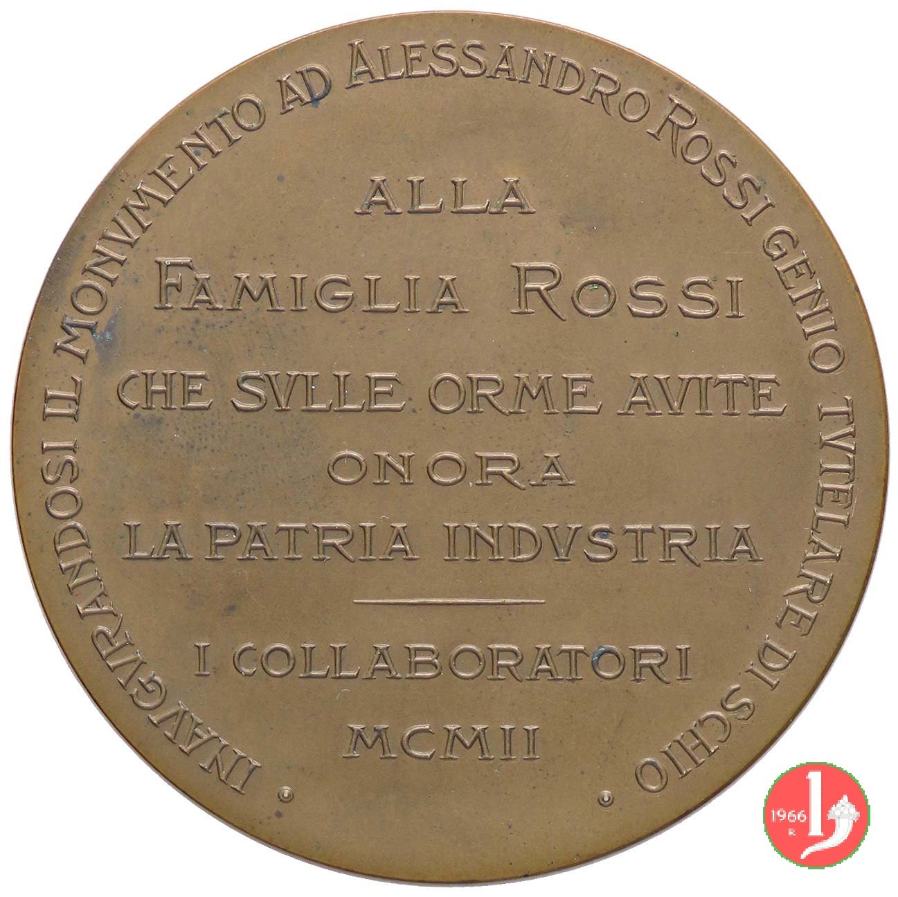 Schio - Monumento di Alessandro Rossi 1902 Dritto: Alessandro Rossi in piedi di fronte presso tavolino su ingranaggio nel campo, a dx: LABORE = ET = VIRTVTE in basso, a sx: DAL BRONZO = DI MONTEVERDE in basso a dx: S. JOHNSON nel campo: ALLA = FAMIGLIA ROSSI = CHE SVLLE ORME AVITE = ONORA = LA PATRIA INDVSTRIA = - = I COLLABORATORI = MCMII |