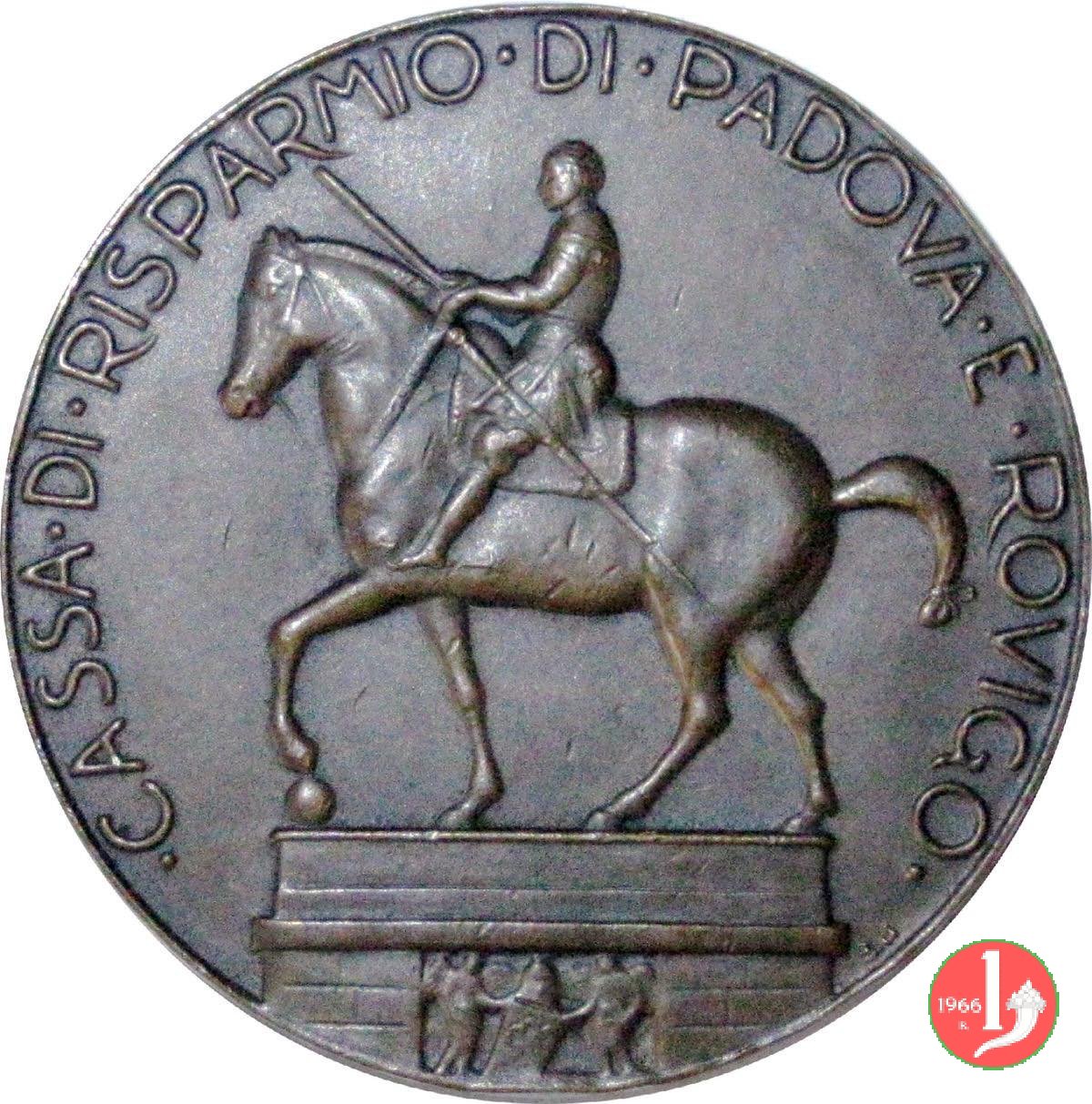 Cassa di Risparmio di Padova e Rovigo 1966 Dritto: _ • CASSA • DI • RISPARMIO • DI PADOVA • E • ROVIGO • Statua equestre del Gattamelata su base a sx in basso, a dx: SJ vista della Nuova sede di Rovigo sotto a dx: C. MANDELLI in basso: 1965 | |
