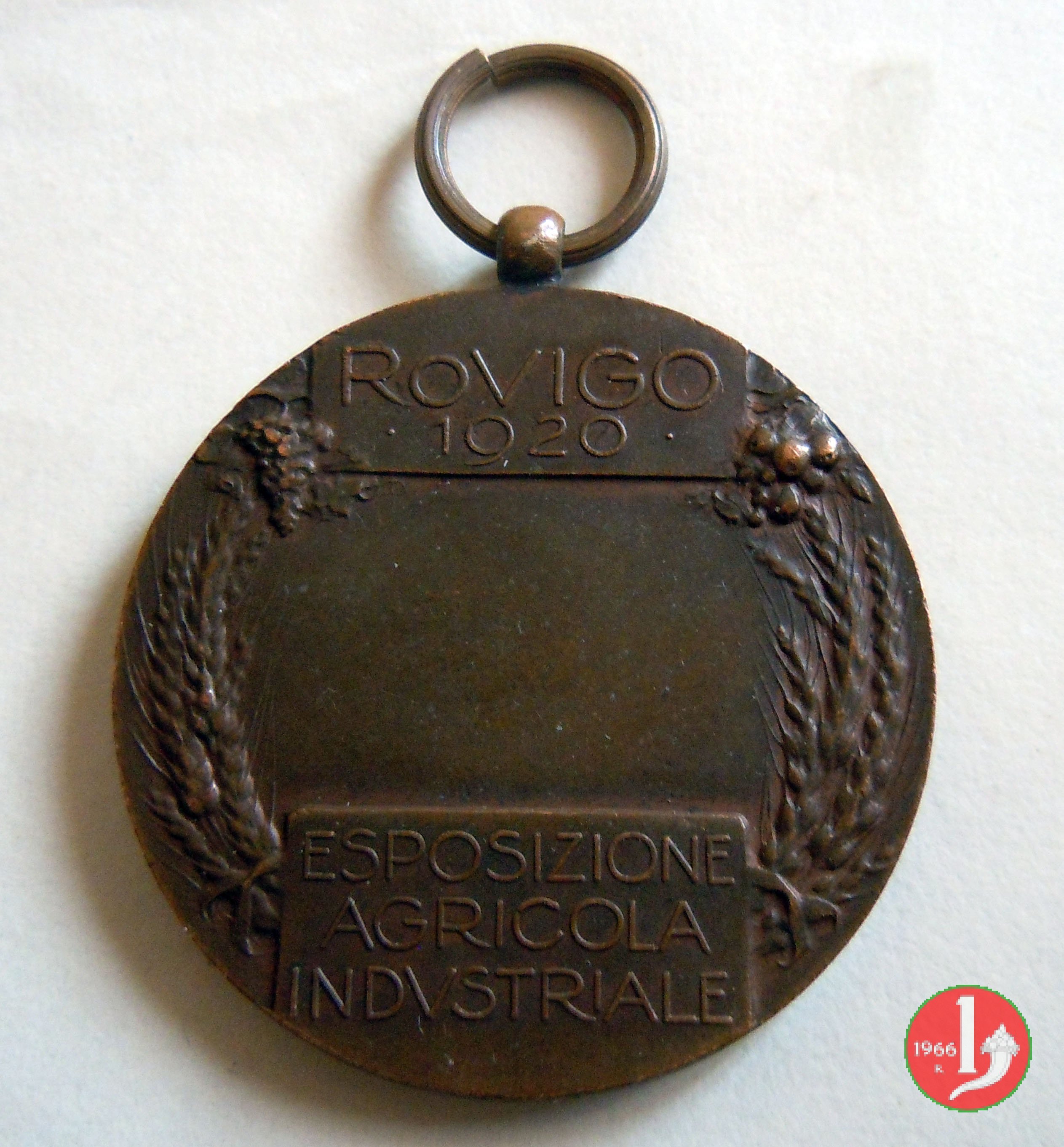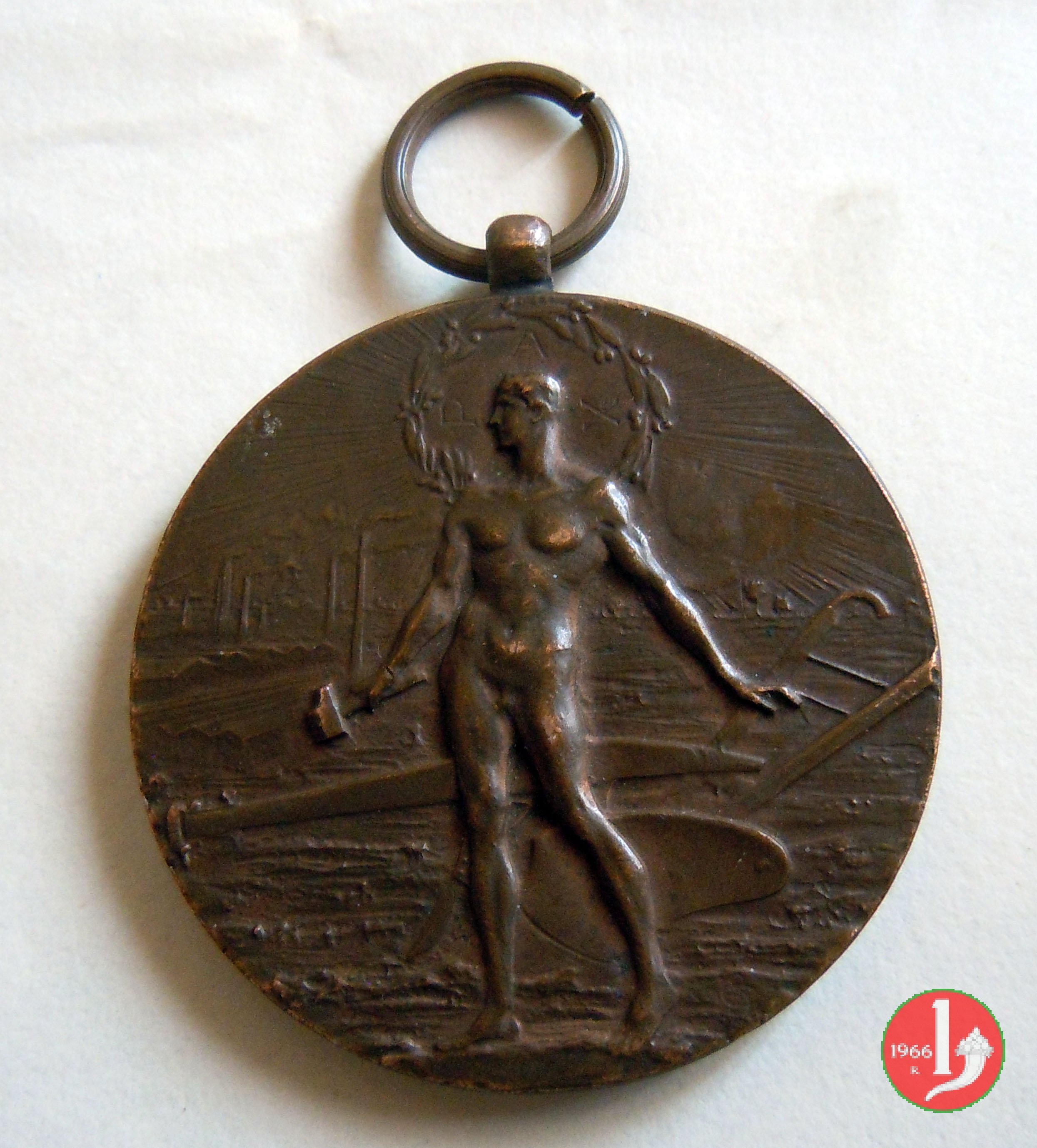 Esposizione Agricola Industriale 1920 Dritto: uomo nudo, in piedi, di fronte, volto a sx, regge martello sul contorno della testa: serto d'alloro raggiante con PAX sullo sfondo: aratro rivolto verso sx e paesaggio industriale in lontananza campo vuoto tra spighe legate da nastro in basso e fermate da targa su cui: ESPOSIZIONE = AGRICOLA = INDVSTRIALE |