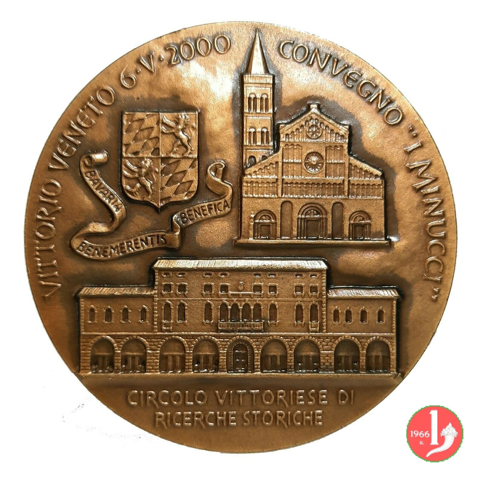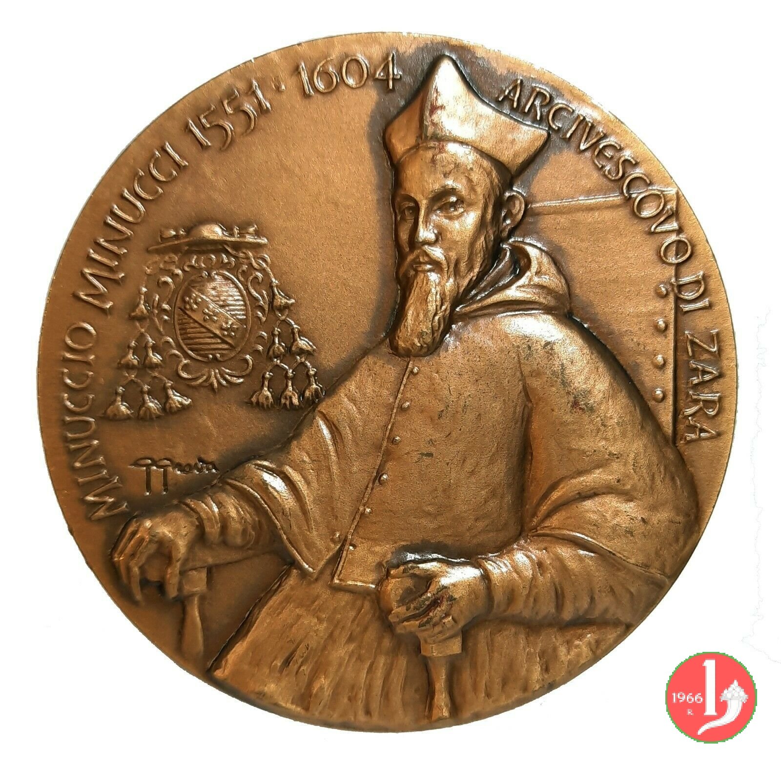 Minuccio Minucci - Vittorio Veneto 2000 Dritto: MINUCCIO MINUCCI 1551 • 1604 _ ARCIVESCOVO DI ZARA mezzo busto seduto, di 3/4 a sx, con berretto, mozzetta e mantellina a sx: Stemma Arcivescovile sormontato da galero a sei nodi nel campo, a sx: G GRAVA in alto a sx: Stemma della Famiglia Minucci con sotto motto in nastro BAVARIA BENEMERENTIS BENEFICA in alto, a dx: Prospetto anteriore della Cattedrale di Zara con il Campanile sotto: Prospetto anteriore di Palazzo Minucci in esergo: CIRCOLO VITTORIESE DI = RICERCHE STORICHE |