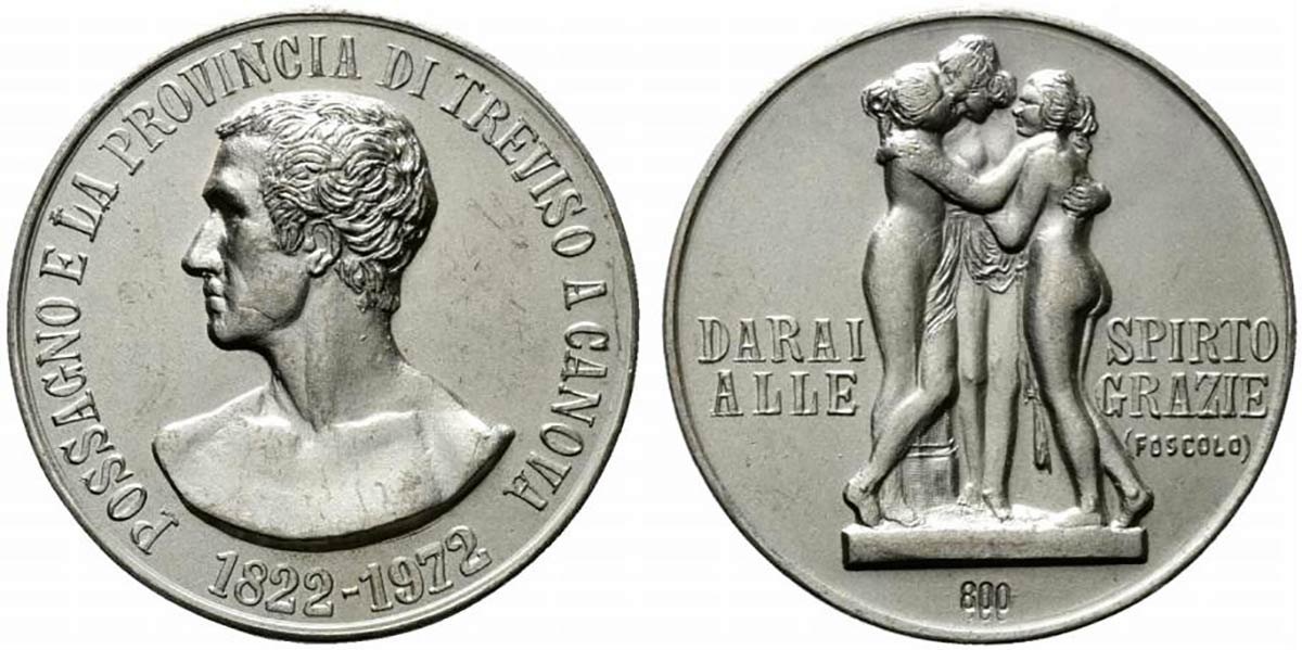 Antonio Canova - Le Tre Grazie 1972 Dritto: POSSAGNO E LA PROVINCIA DI TREVISO A CANOVA = 1822-1972 busto nudo a sx ai lati, nei campi: DARAI _ SPIRTO = ALLE _ GRAZIE = (FOSCOLO) sotto: MISTRVZZI |