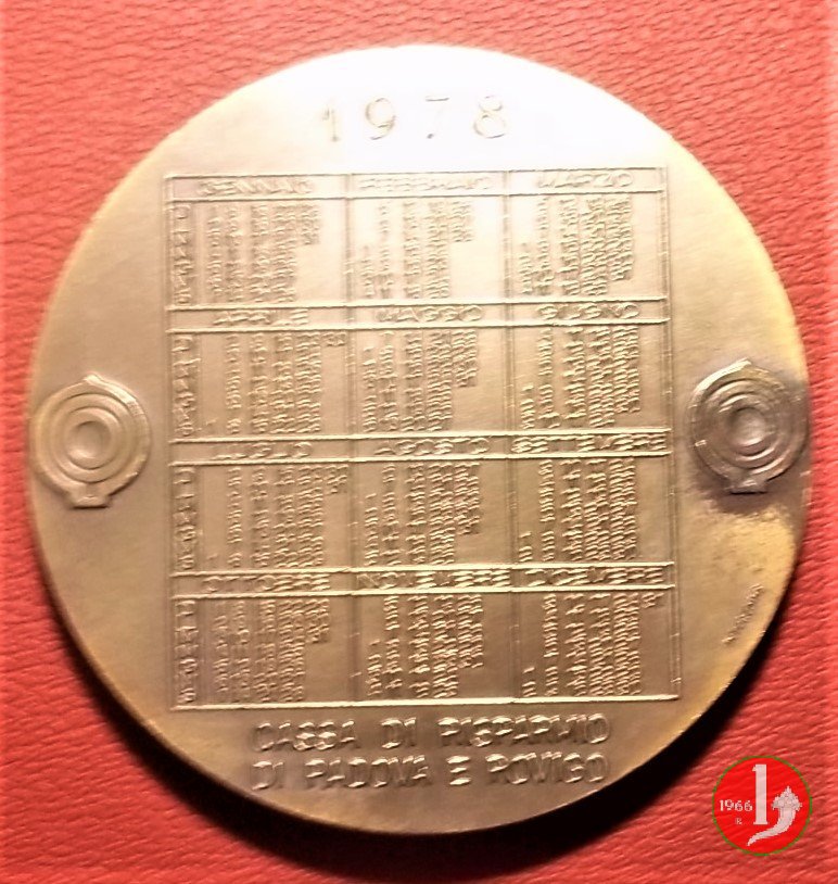 Cassa di Risparmio di Padova e Rovigo Calendario 1978 Dritto: busti di due pescatori volti a sx in basso, sul braccio: SGARAVATTI al centro tra due salvadanai: calendario dell'anno 1978 a dx, presso il bordo: INTERCOINS in esergo: CASSA DI RISPARMIO = DI PADOVA E ROVIGO |