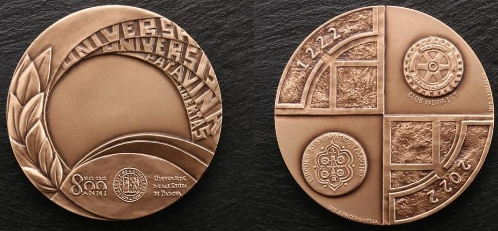 800° Università di Padova 2022 Dritto: in alto entro nastri sovrapposti e disposti presso il bordo: UNIVERSA = UNIVERSIS = PATAVINA = LIBERTAS a sx: ramo di alloro in esergo: logo dell'Università di Padova tra il logo delle celebrazioni 800 ANNI e _ UNIVERSITA' = DEGLI STUDI = DI PADOVA in alto a sx e in basso a dx motivo geometrico su goffratura contenenti cornici con 1222 _ 2022 in basso a sx: logo Università di Padova in alto a dx: logo Rotay Club Padova in basso a sx: DIS. A. PACCAGNELLA a dx presso il bordo: INC. L. PANCOTTO |