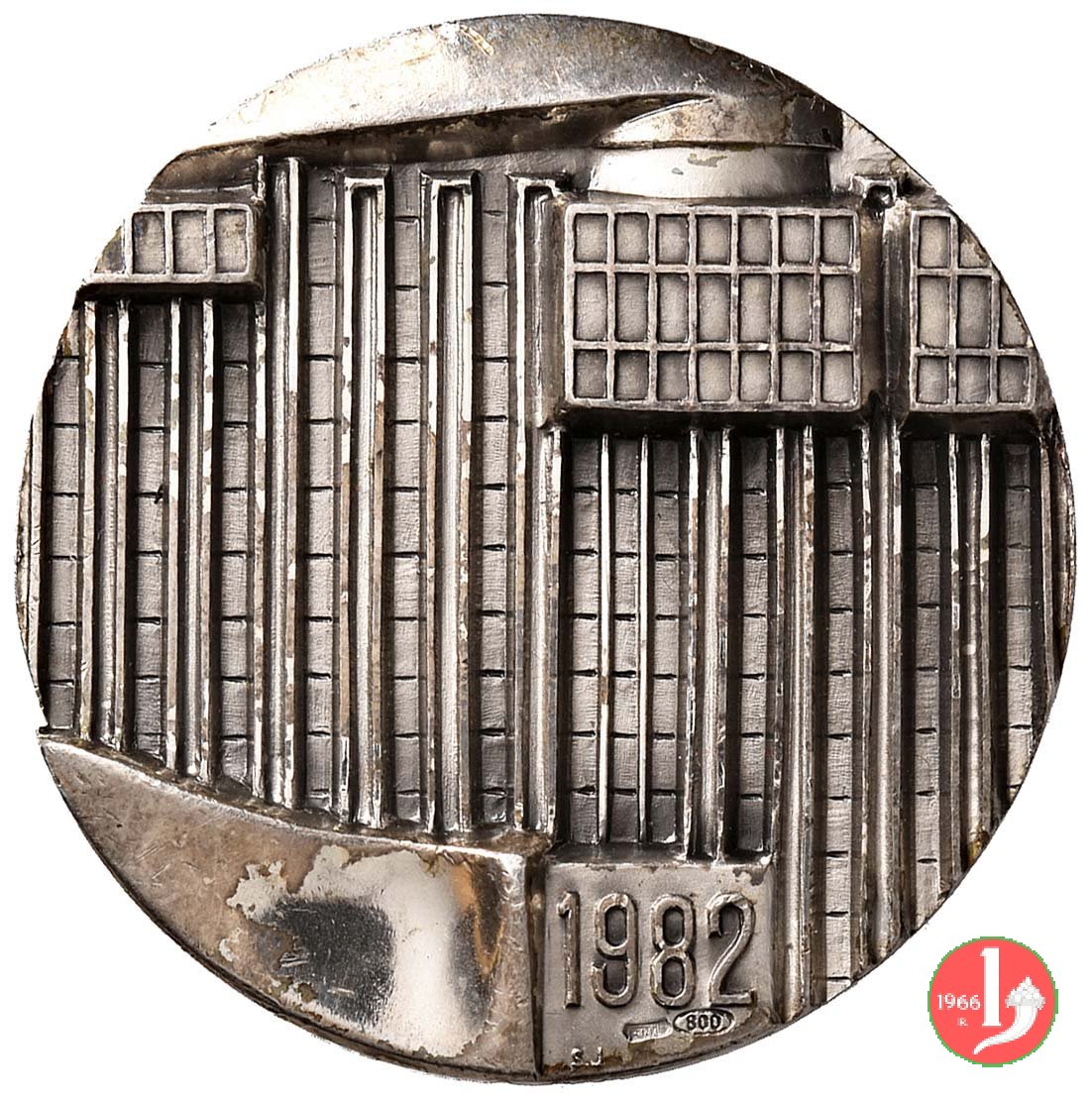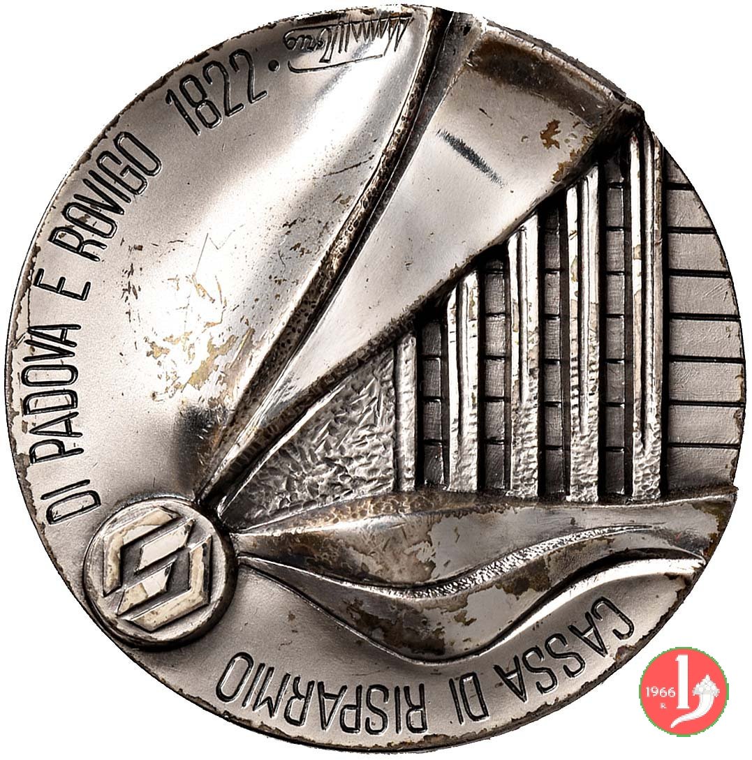 Cassa di Risparmio di Padova e Rovigo 1982 Dritto: CASSA DI RISPARMIO _ DI PADOVA E ROVIGO 1822 forma piramidale con elementi geometrici in basso,a dx: Vivarelli sotto: 1982 in basso: S.J. |