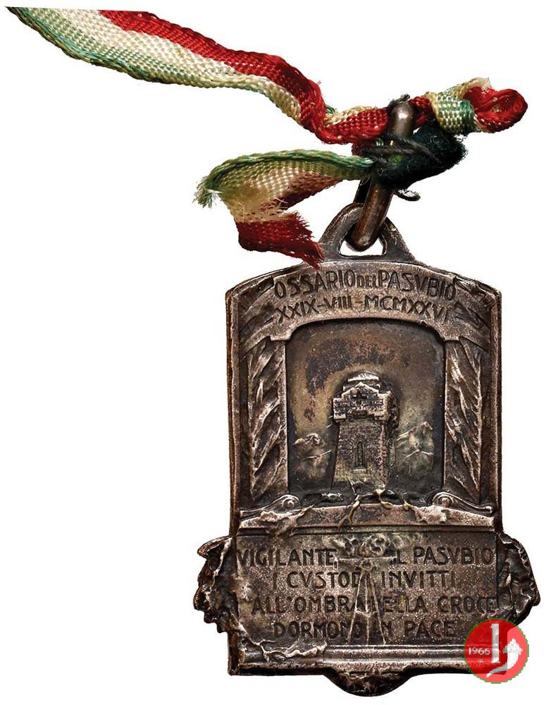 Ossario del Pasubio 1926 Dritto: in alto: OSSARIO DEL PASVBIO = XIX - VIII - MCMXXVI entro cornice adornata lateralmente da rami d'alloro: Vista dell'Ossario a torre del Pasubio in basso entro targa su rami d'alloro e ai lati di braciere ardente: VIGILATE SVL PASVBIO = I CVSTODI INVITTI = ALL'OMBRA DELLA CROCE = DORMONO IN PACE Vista dell'Ossario con la scalinata d'ingresso tra fronde d'alloro |