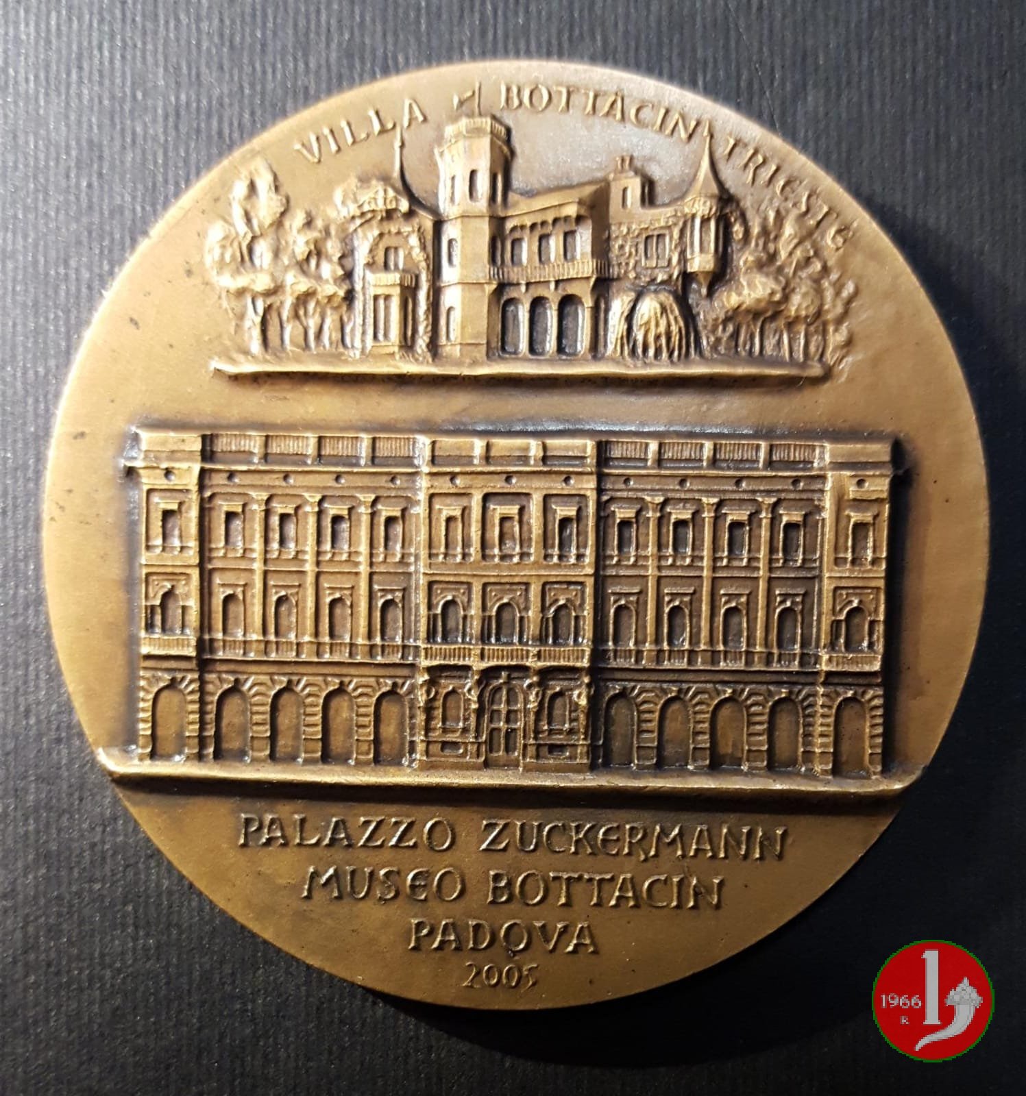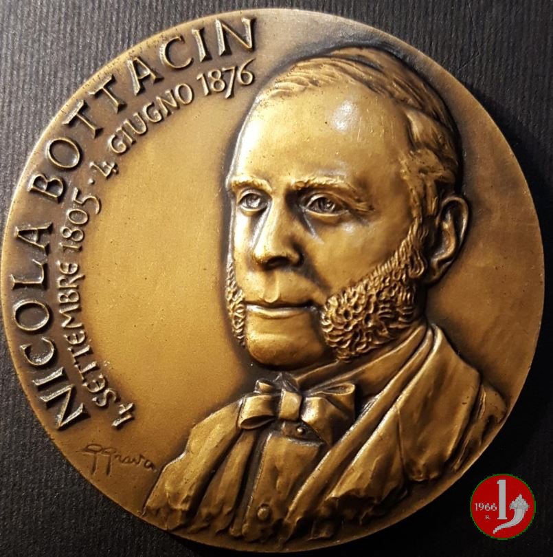Nicola Bottacin 2005 Dritto: NICOLA BOTTACIN = 4 SETTEMBRE 1805 • 4 GIUGNO 1876 busto di 3/4 a sx con giacca, camicia e papillon in basso a sx: G GRAVA vista della Villa sotto: prospetto anteriore di Palazzo Zuckermann a Padova in esergo: PALAZZO ZUCKERMANN = MUSEO BOTTACIN = PADOVA = 2005 |