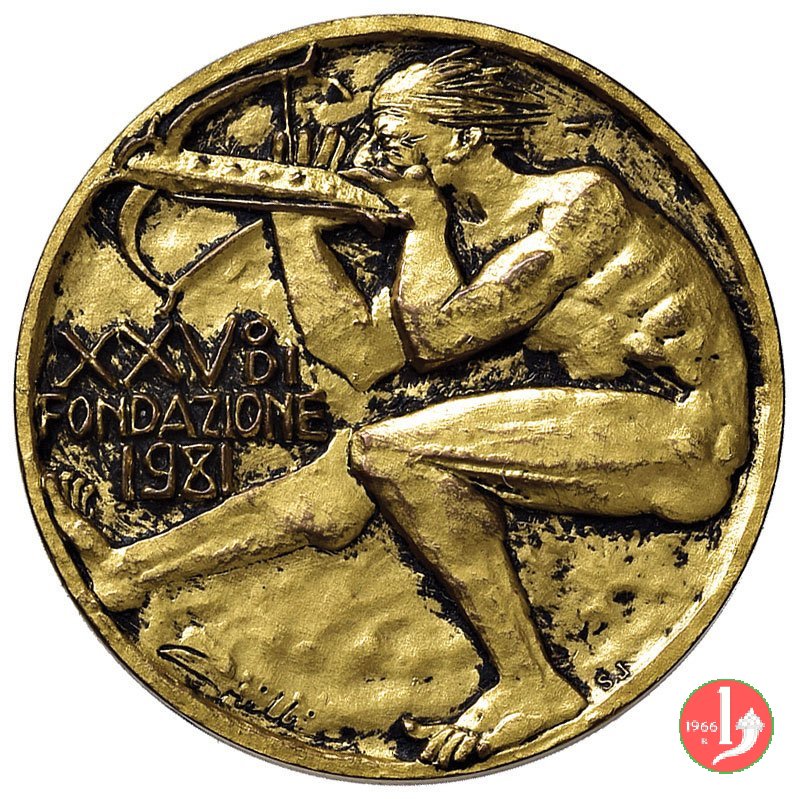 25° Balestrieri di San Marino 1981 Dritto: Balestriere nudo a sx regge balestra nel campo, a sx: XXV° DI = FONDAZIONE = 1981 in basso: GRILLI _ SJ Testa di San Marino di fronte, regge in mano a dx tre torri piumate | |