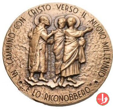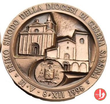Sinodo della Diocesi di Cesena - Sarsina 1998 Dritto: IN CAMMINO CON CRISTO VERSO IL NUOVO MILLENIO = * "....E LO RICONOBBERO" * Gesú Cristo e due Apostoli nimbati in piedi entro cornice circolare: Viste anteriori del Duomo di S. Giovanni Battista in Cesena e del Duomo di S. Vicinio in Sarsina e in basso, entro medaglia, Stemma Vescovile sormontato da galero a sei nodi (o nappe) in basso a sx nel bordo interno: CIMAROSTI in basso a dx: CDF |