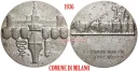 Comune di Milano - Il Carroccio Dritto: Prospetto anteriore del Castello Sforzesco in esergo: Stemma turrito di Milano tra sei stemmi in alto, biscione e fascio repubblicano verticale in basso, intorno 1176 _ 1848 = 1859 _ 1915 _ 19 _ 19 in basso: G.CASTIGLIONI a dx della linea dell'esergo: SJ in esergo inciso: spazio per dedica = 2 ottobre 1935 • XIII = 2 ottobre 1936 • XIV | |