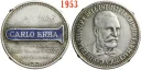 Carlo Erba 1953 Dritto: CARLO ERBA • PIONIERE DELL'INDUSTRIA CHIMICO FARMACEUTICA • busto di 3/4 a dx con giacca, camicia e nastro in basso a dx: SG entro provetta orizzobntale con fondo a smalti blu: CARLO ERBA sotto corsivo: ALL'AVANGUARDIA = NELLA RICERCA E NELLA = PRODUZIONE | |