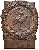 Concorso Ginnastico-Scolastico 1926 Dritto: entro ghirlanda d'alloro ed entro medaglia: figura allegorica della Vittoria alata seduta su leone gradiente a dx, regge cornucopia floreale ed asta luminescente in basso a dx monogramma: C (?) in esergo: ramo d'alloro sotto, entro targa: MILANO = VII° CONCORSO GINNASTICO = SCOLASTICO = 1926 | |