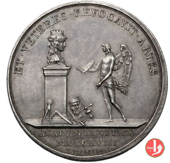 Accademia Ligustica di Belle Arti 1758 -A378/379 Dritto: ET • VETERES • REVOCAVIT • ARTES Angelo, a sx, regge tavolozza e pennella, in piedi, guarda busto bifronte coronato su base; a terra: squadra, compasso, piombo e busto in esergo: ACADEM • LIGUSTICA = MDCCLVIII in basso: VASSALLO entro serto d'alloro legato in basso da nastro: MERENTIBUS |