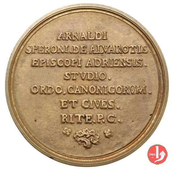 Chiesa di S. Maria in Villa Guardia -V1592 Dritto: D ARNALDVS • SPERONIVS • NOB • PATAV • EPIS • ADRIEN • PRIMVM • LAP • POS • busto a dx con zucchetto, mantellina e Croce pettorale |