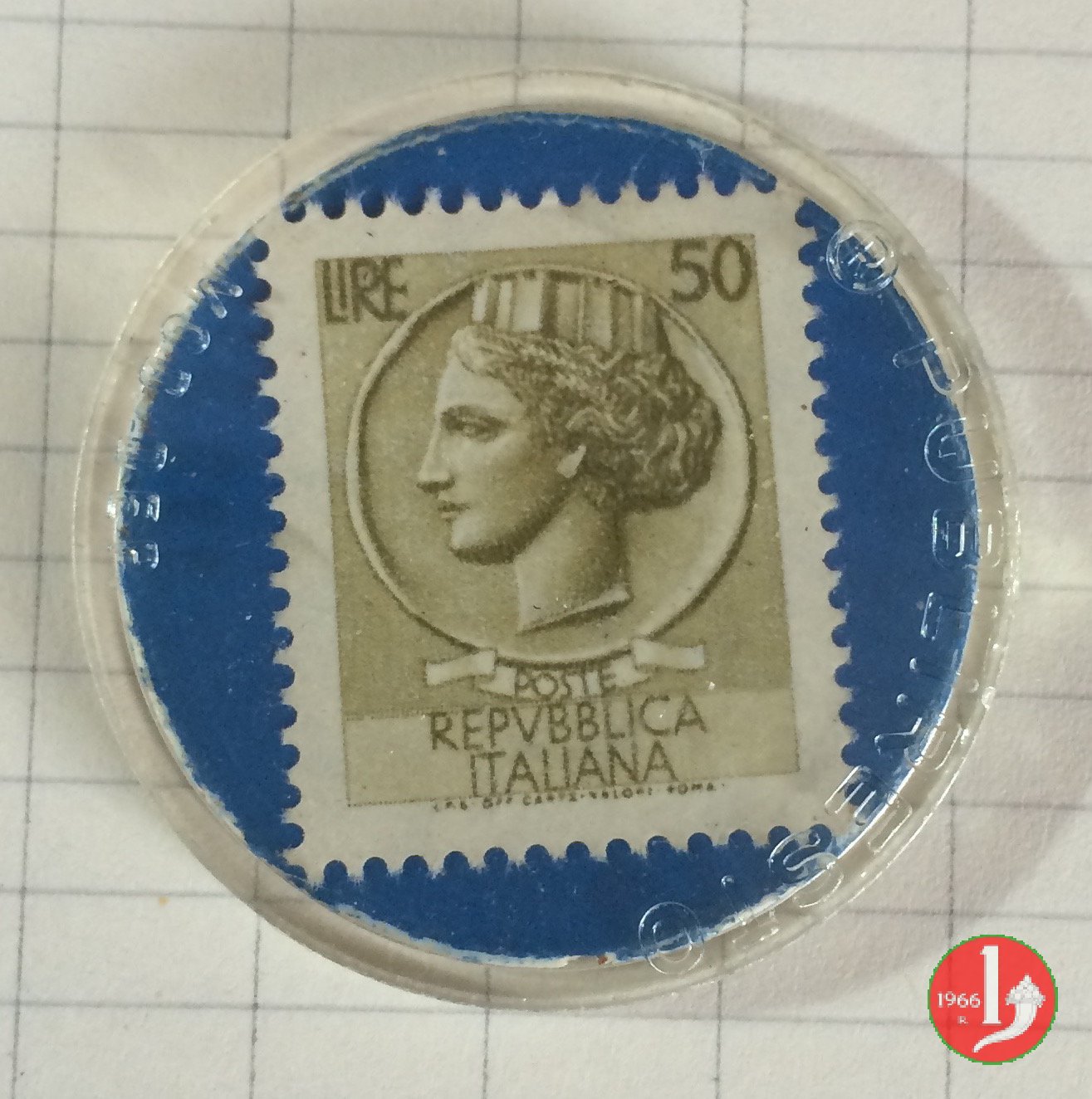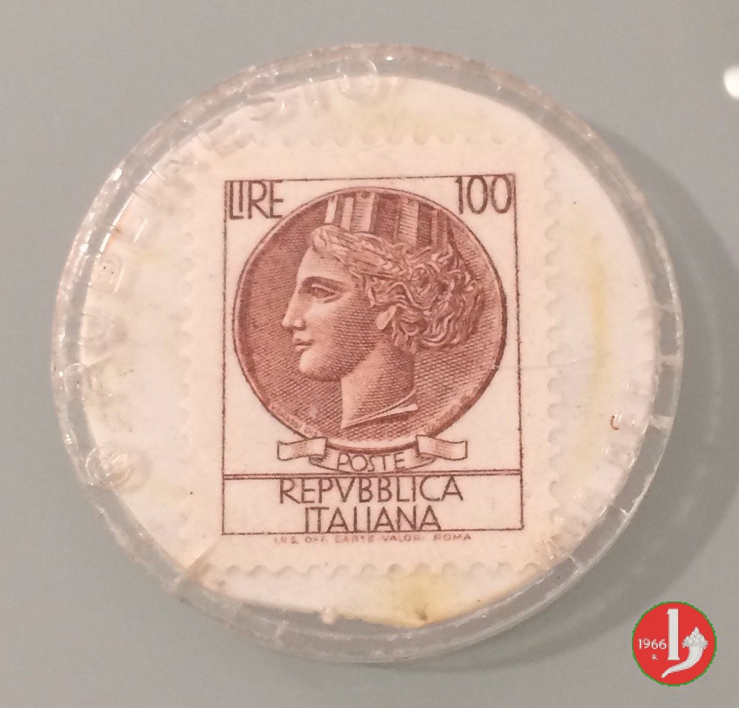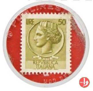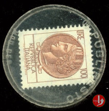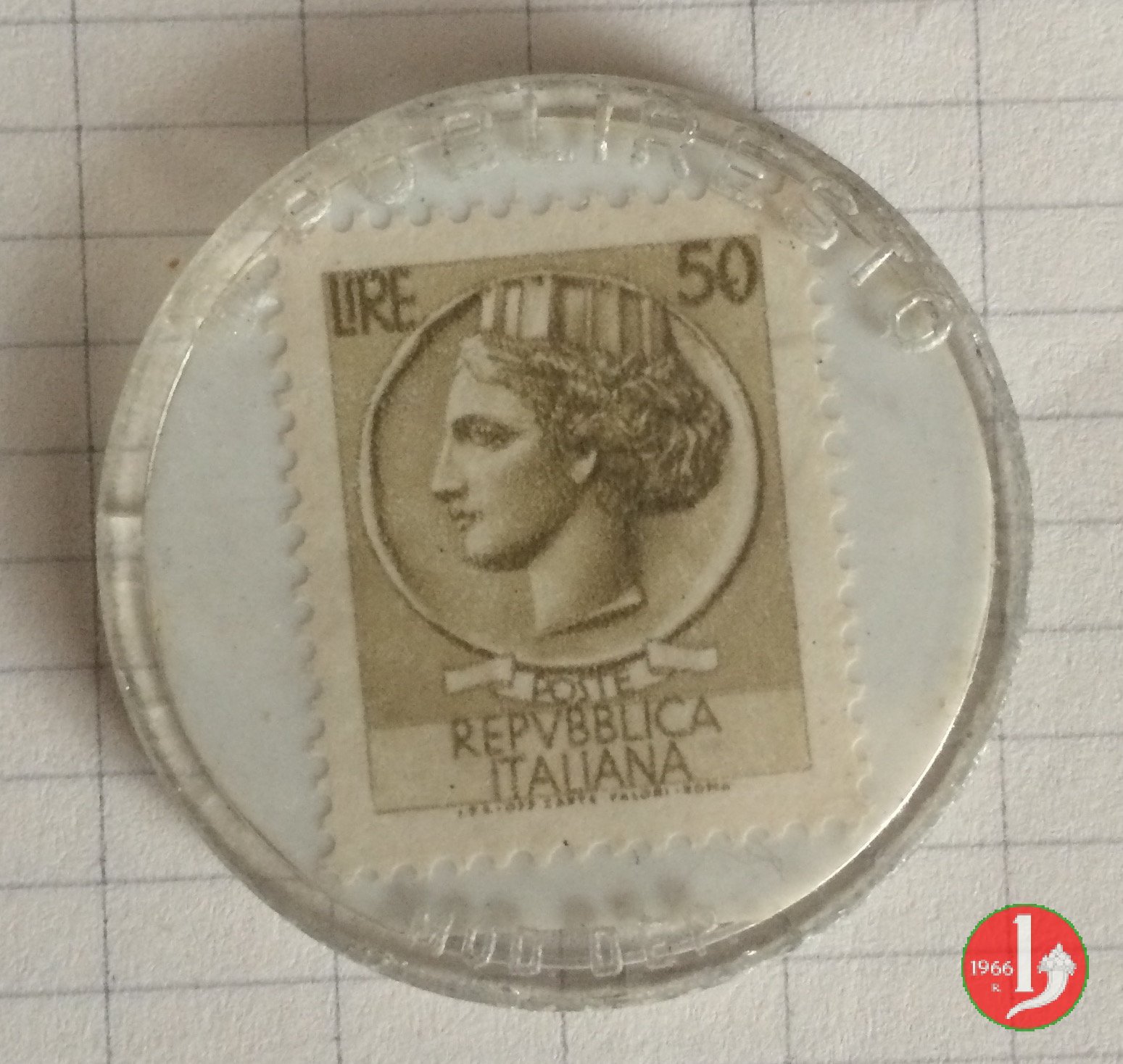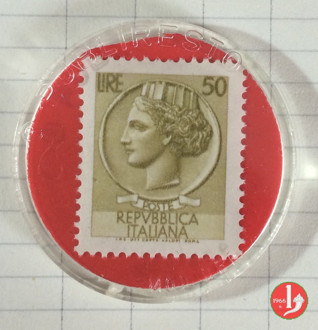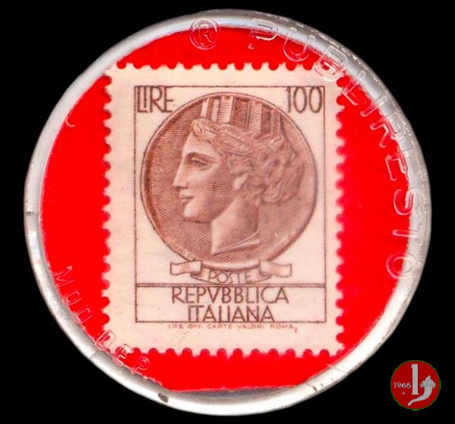 Dritto: Marchio PUBLIRESTO su plastica trasparente. Francobollo di vari valori serie siracusana.