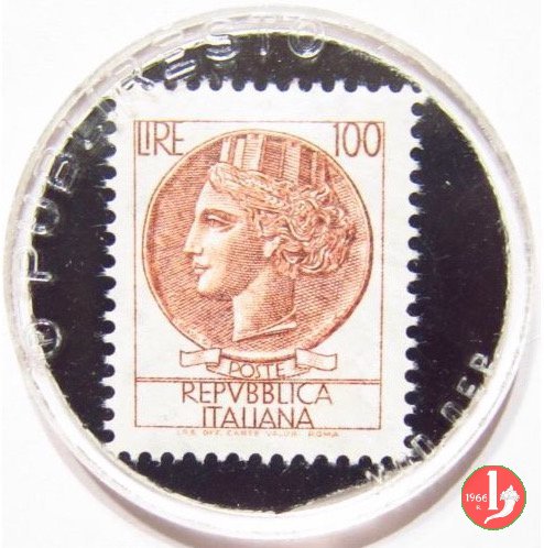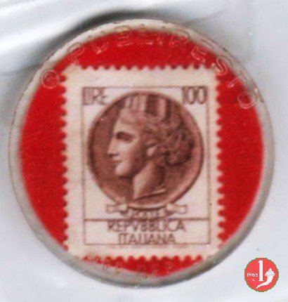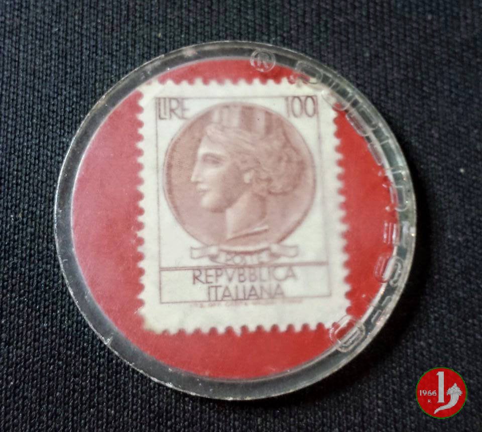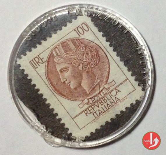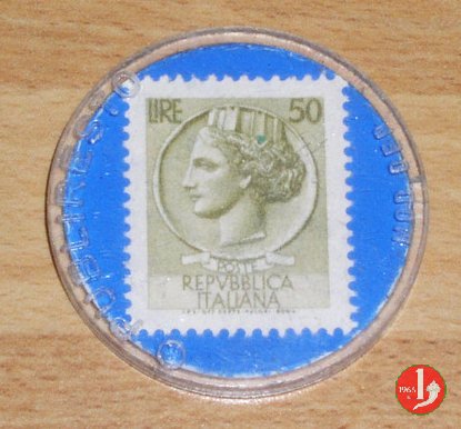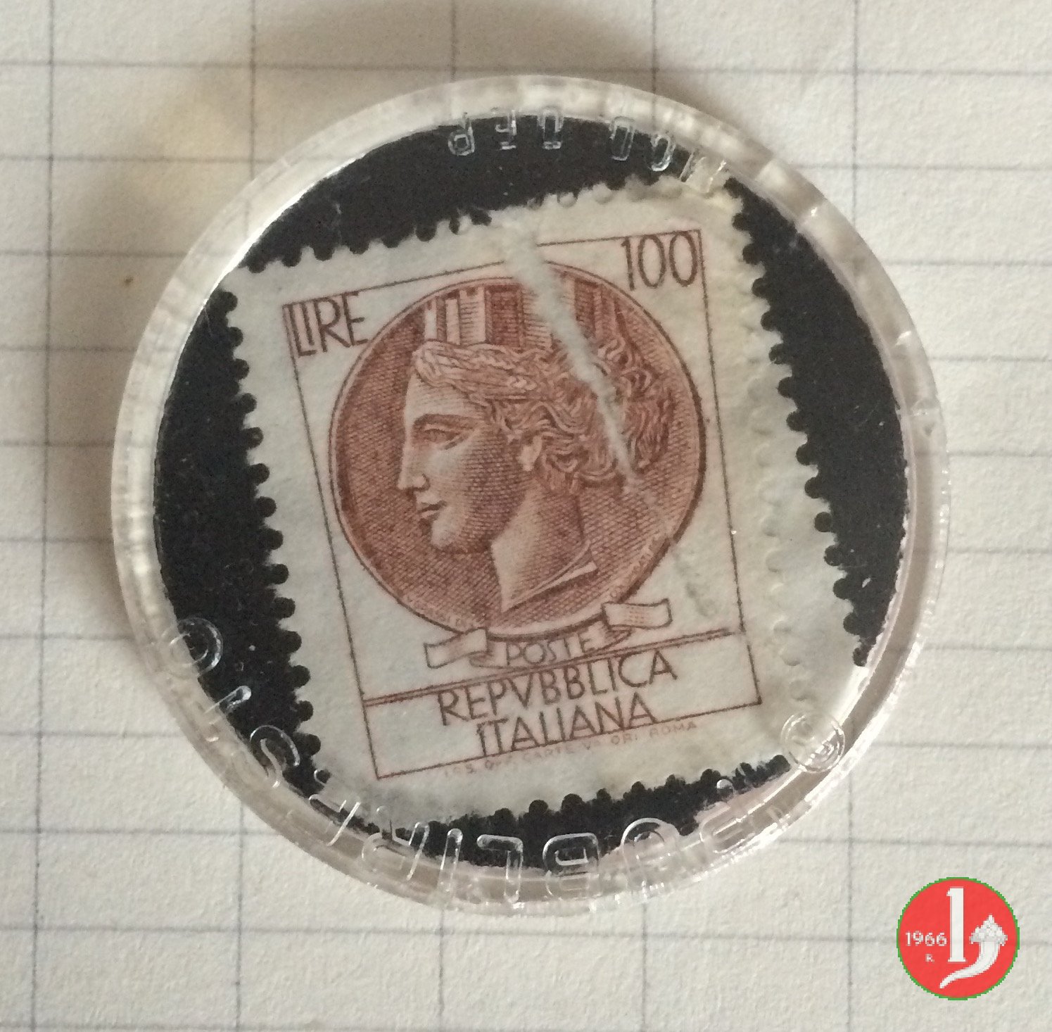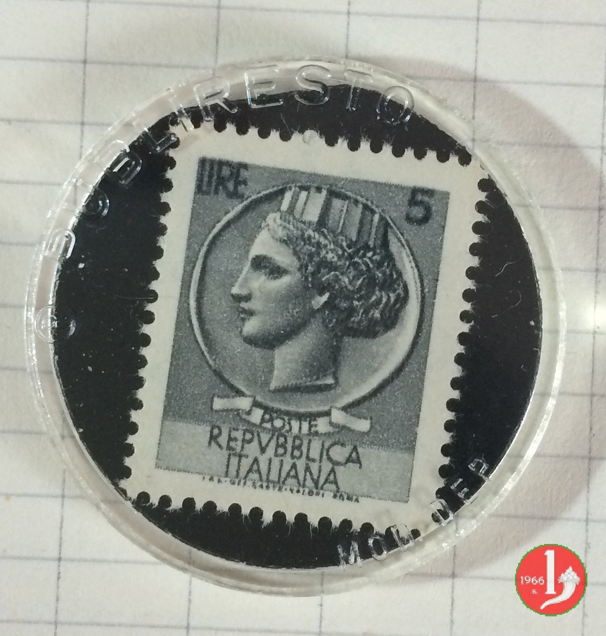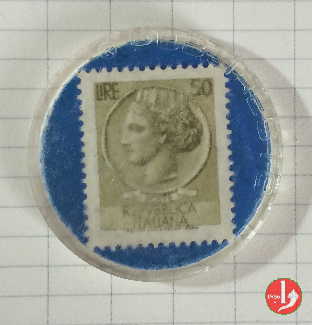 Dritto: Francobollo incapsulato all'interno del tondello in alluminio, protetto da una pellicola di celluloide.
