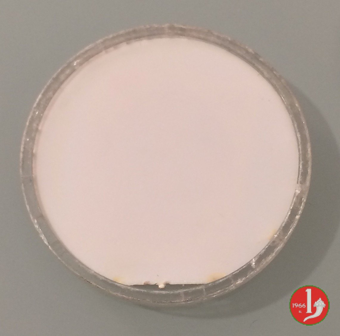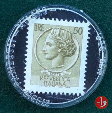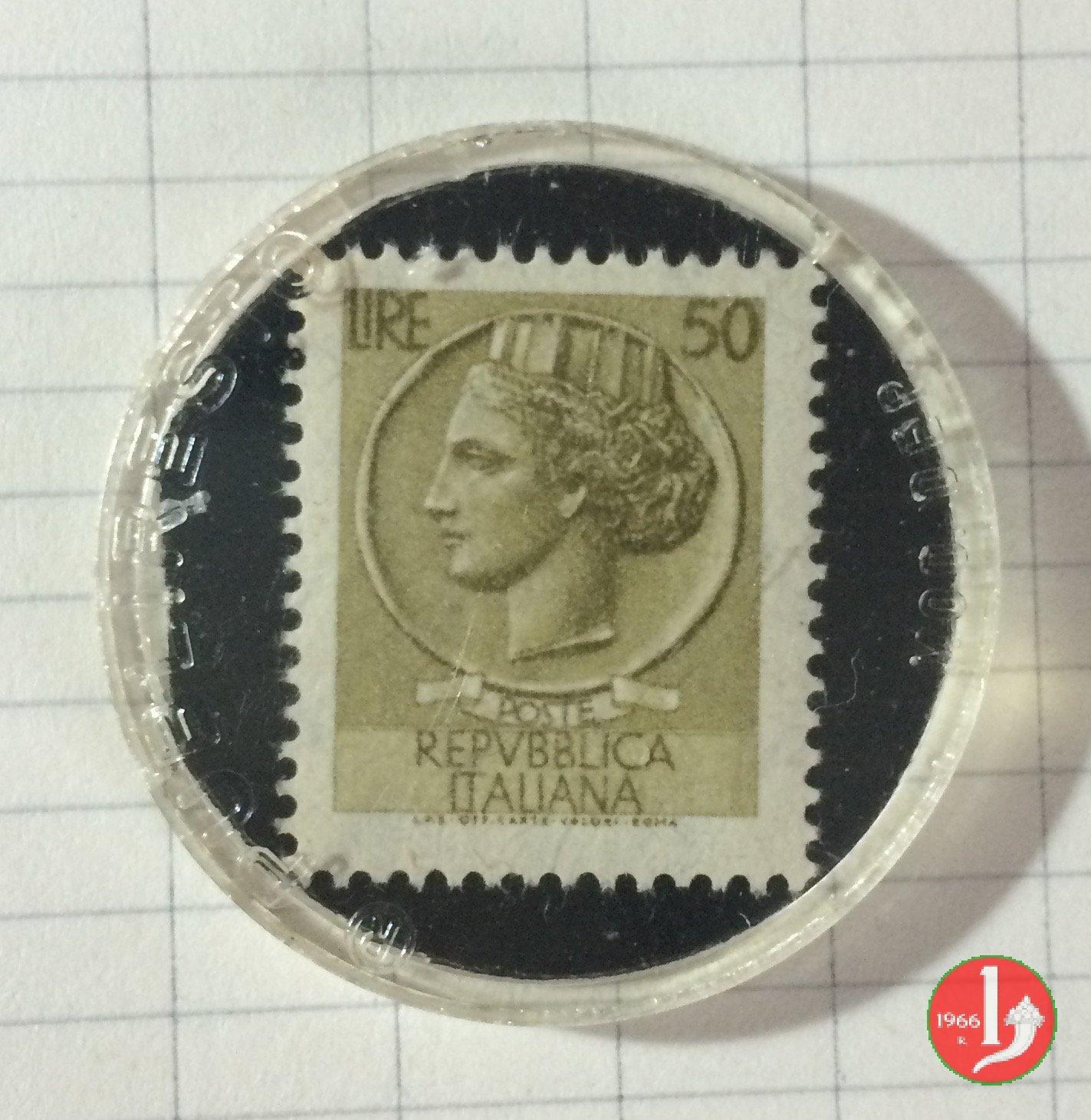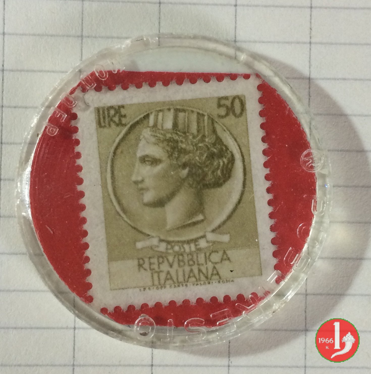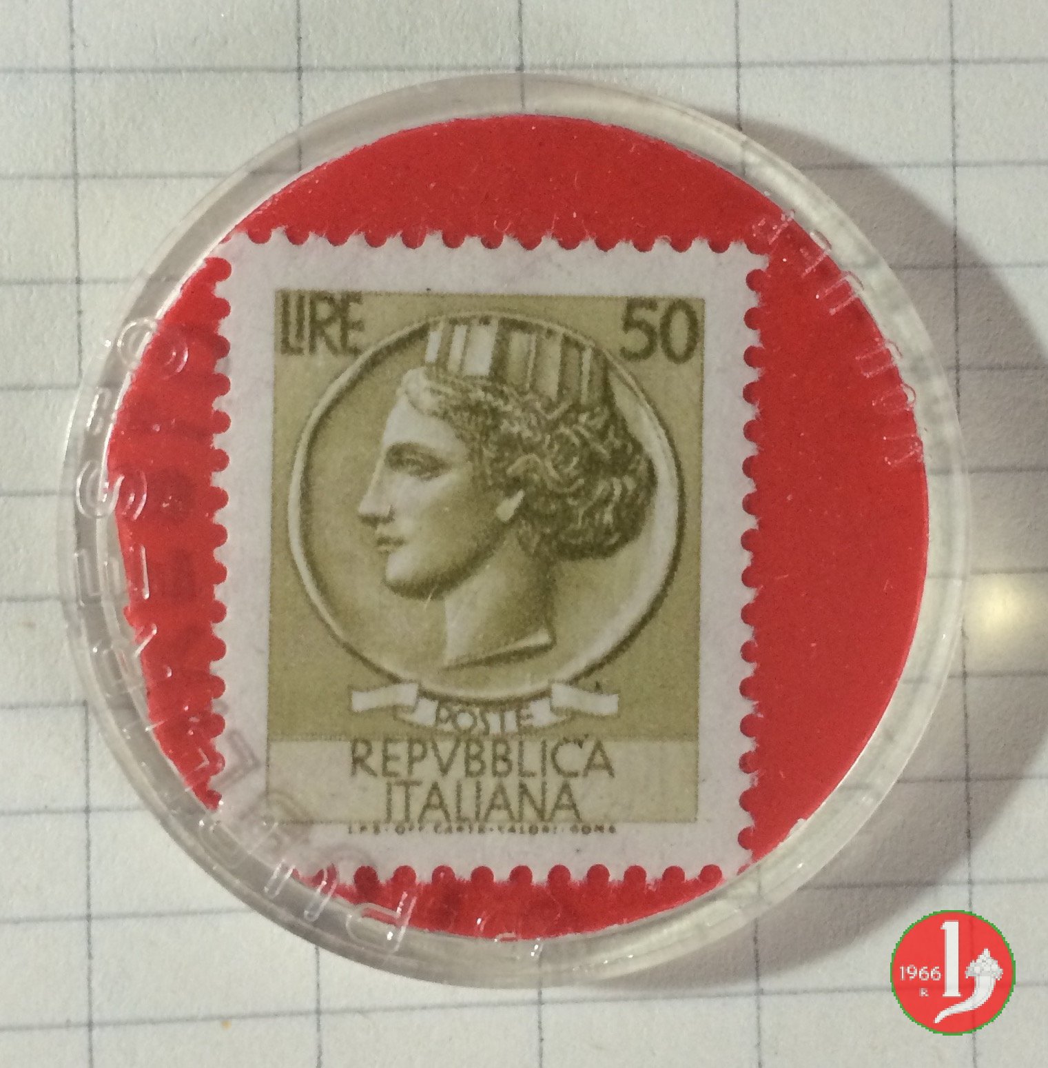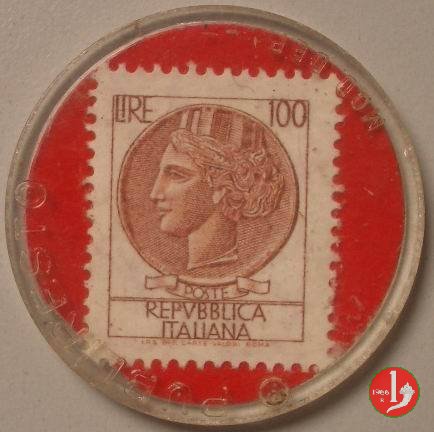 Dritto: Francobollo incapsulato all'interno del tondello in alluminio, protetto da una pellicola di celluloide.