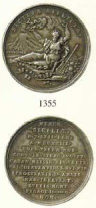 Verso: nel campo legenda su 13 righe: ME MOR. = SICILIAE = D. 9 ET 11 IAN. = AN. MDCXCIII. = HORR. TERRAE MOT. = CONVVLS. SYRAC. AVGVST. = CATAN. MESSIN. XIV. VRBIB. = = MAI CORRVENTIBVS. XVI. MIN = PROSTRATIS IN AMNES = MAR. INFLVENT. = RVPTIS. MONT. = STRAGE 100.000. = HOM.