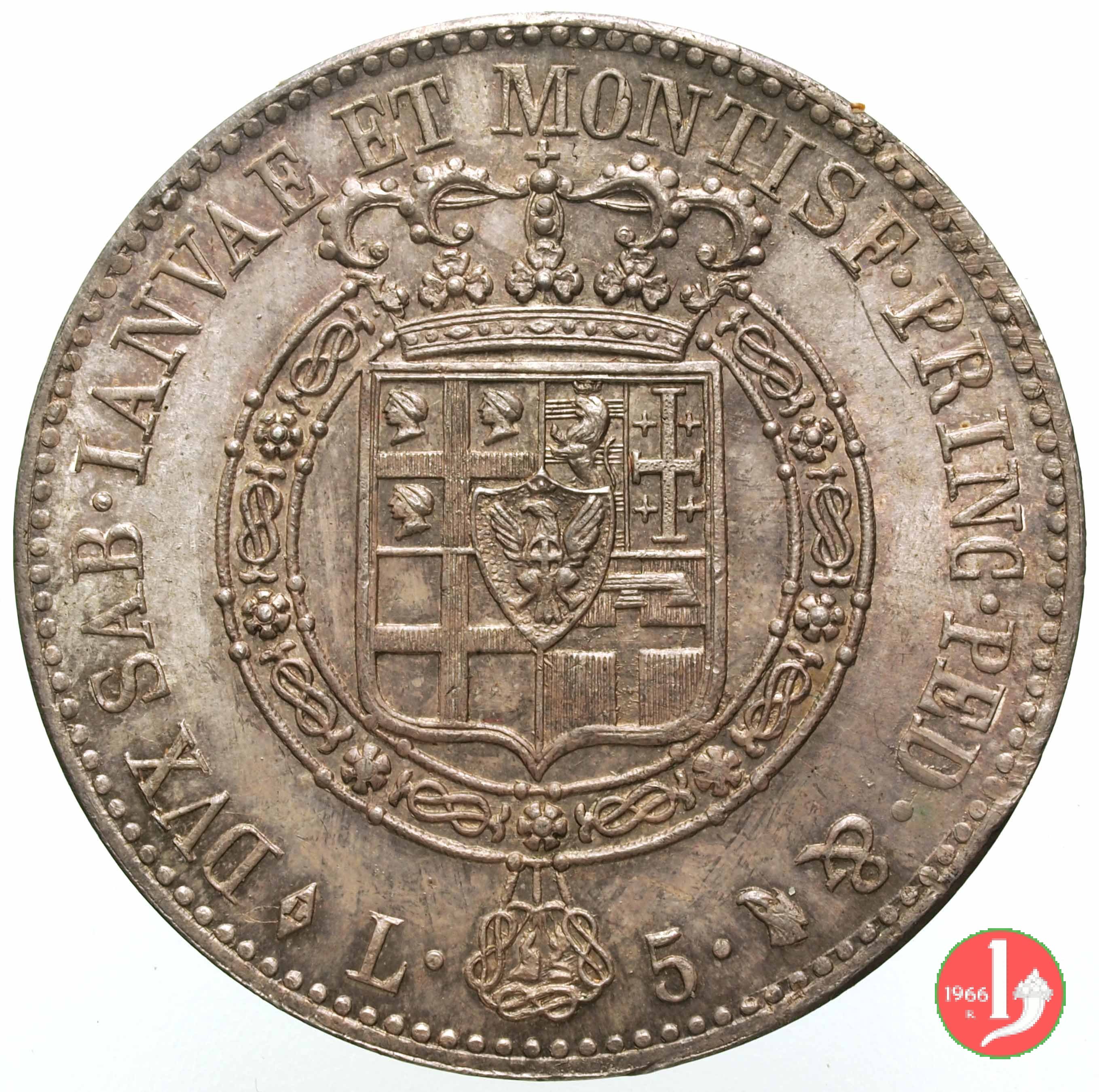 Scudo Dritto: Testa del Re a destra, al di sotto della quale si trova il millesimo. Lungo il bordo, VICTORIUS EMANVEL II D • G • REX SARD • CYP • ET HIER • Sul taglio del collo indicazione dell'autore (FERRARIS). Verso: Stemma con croce Sabauda sovrastato da Corona Reale e fregiato dal collare dell'Annunziata tra rami di lauro. Lungo il bordo: DVX SAB • GENVAE ET MONTISF • PRINC • PED • &. In basso, da sinistra a destra, segno di zecca e indicazione del valore (L • 5). |