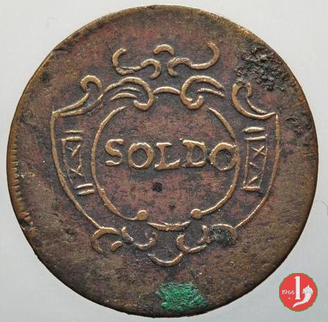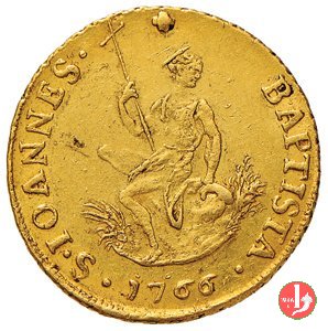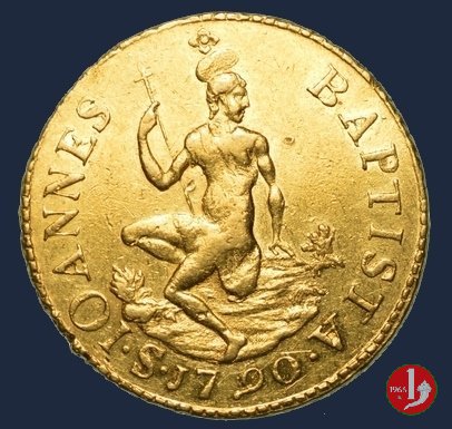 Verso: (da sinistra) S • IOANNES BAPTISTA il Santo,nimbato,con veste di pelo, seduto su zolla erbosa un poco a sinistra,tiene la destra alzata e con la sinistra lunga croce verticalmente appoggiata alla spalla.Presso il suo piede sinistro,agnello accovacciato:in basso sotto l'agnello sulla zolla (anno in cifre)