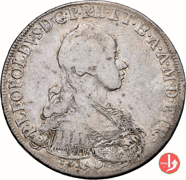 Dritto: (da sinistra) PETRVS LEOPOLDVS stella a 6 punte D stella a 6 punte G stella a 6 punte P stella a 6 punte R stella a 6 punte H stella a 6 punte ET stella a 6 punte B stella a 6 punte A stella a 6 punte A stella a 6 punte M stella a 6 punte D stella a 6 punte ETRVR stella a 6 punte busto a d.come precedente ma l'armatura è differente; compare la croce di sinistraStefano sul petto e il Toson d'oro è piú grande; sotto nel giro accette decussate (Zecchiere Antonio Fabbrini)