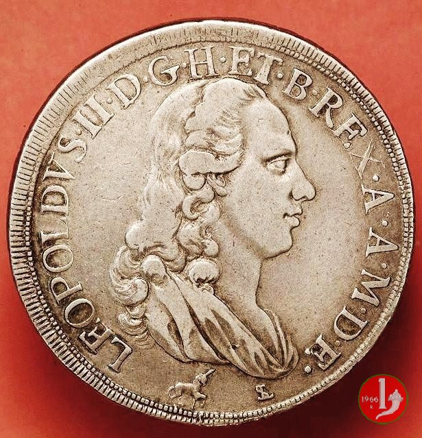 Dritto: (da sinistra) PETRVS LEOPOLDVS D • G • P • R • H • ET • B • A • A • M • D • ETRVR • busto a destra con parrucca annodata dietro il collo e con le insegne del Toson d'oro; sotto la spalla in caratteri minutissimi L • S