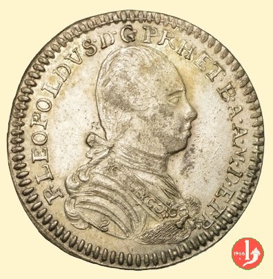 Dritto: (da sinistra) P • LEOPOLDVS D • G • P • R • H • ET • B • A • A • M • D • ETR • busto a destra coi capelli raccolti da nastro annodato, corazzato e col toson d'oro; sul taglio del braccio in caratteri minutissimi sigla di Cingarelli ( A • C • F • )