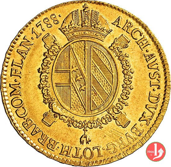 1 sovrano Dritto: Stemma ovale degli Asburgo-Lorena sormontato da corona imperiale e ornato dal collare del Toson d'Oro. Intorno, ARCH • AVST • DVX • BVRG • LOTH • BRAB • COM • FLAN • e il millesimo. Verso: Testa dell'Imperatore con corona di alloro a destra, intorno FRANC • II • D • G • R • IMP • S • A • GE • HIE • HV • BO • REX •. In esergo il segno di zecca (M). |