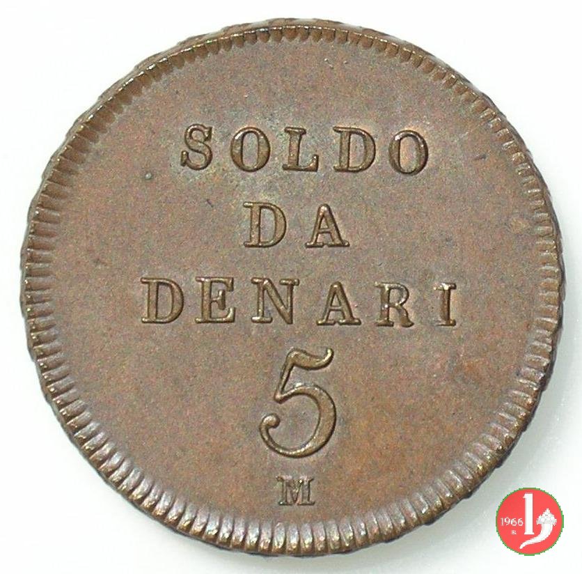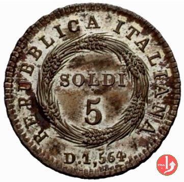 5 soldi Dritto: Bilancia a due bracci sovrapposta ad un ramo di palma e spada che si incrociano legati da un nastro, intorno REPUBBLICA ITALIANA. In basso indicazione del millesimo (1804 • III). Verso: Indicazione del valore su 2 righe (10 SOLDI) all'interno di due rami di quercia incrociati e legati con un nastro. In esergo indicazione del valore (DEN • 1 •) sotto al quale si trova il segno di zecca (M). |