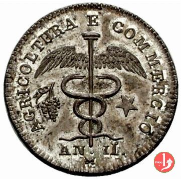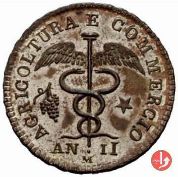 2 soldi Dritto: Squadra a bracci munita di filo a piombo (utilizzata anche per il puntamento dei cannoni) sormontata da berretto frigio e circondata da rami di quercia. Sotto l'indicazione dell'anno secondo il calendario rivoluzionario (AN • 9 • ovvero 1800-1801). Intorno le due parole LIBERTÀ EGUAGLIANZA separate da rosette a sei petali. Verso: La scritta SOLDI DUE su due righe in corsivo all'interno di un cerchio. Intorno, sempre ornata da rosette a sei petali, la scritte NAZIONE PIEMONTESE. |