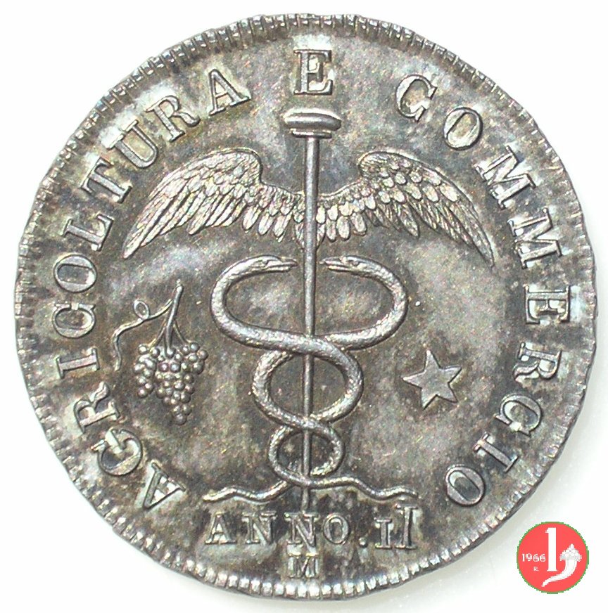 Mezzo Scudo Dritto: ANNO • VII • REP • I • DELLA • LIBERTÀ • PIEMONTESE e una rosetta a sei petali. Nel campo tra rami di quercia, su due righe MEZZO / SCUDO (indicazione del valore). Verso: LIBERTÀ • VIRTÚ • EGUAGLIANZA •, figura allegorica della Gallia Subalpina con fascio con scure e e pileo, sullo sfondo il Monviso. CNI 4. Pagani 1/a/b. |