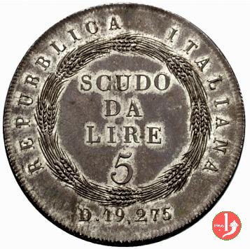 scudo Dritto: Bilancia a due bracci sovrapposta ad un ramo di palma e spada che si incrociano legati da un nastro, intorno REPUBBLICA ITALIANA. In basso indicazione del millesimo (1804 • III). Verso: Indicazione del valore su 2 righe (5 LIRE) all'interno di due rami di quercia incrociati e legati con un nastro. In esergo indicazione del valore (DENARI • 20 •) sotto al quale si trova il segno di zecca (M). | |