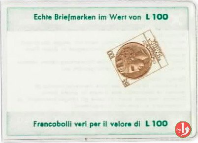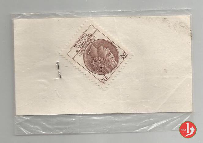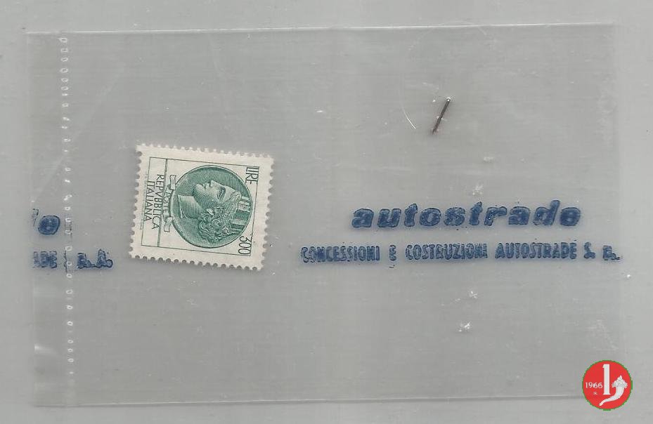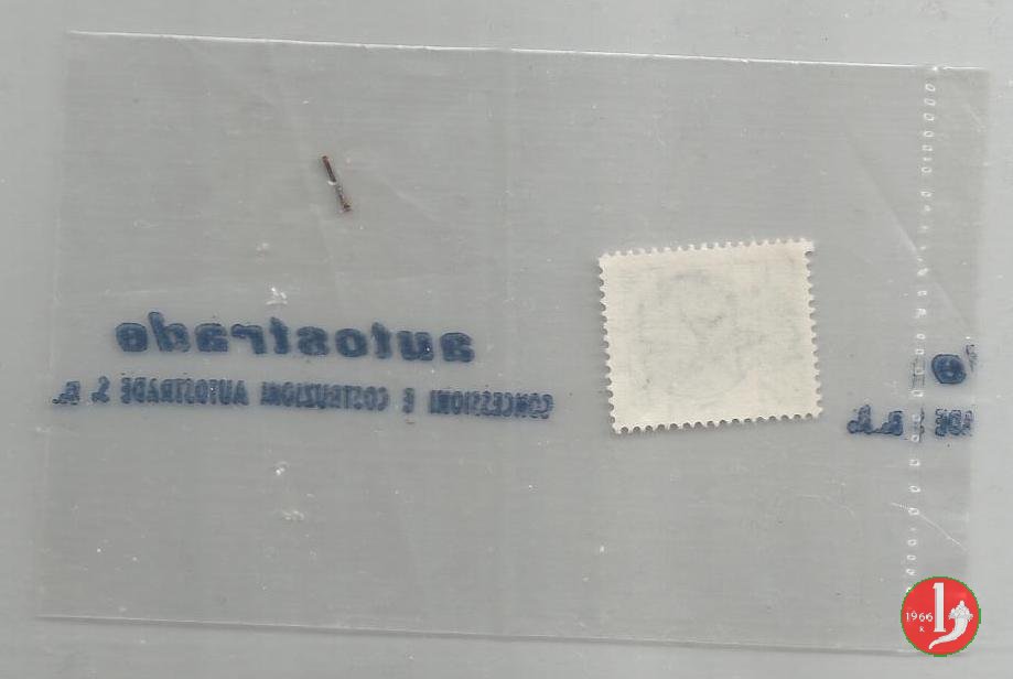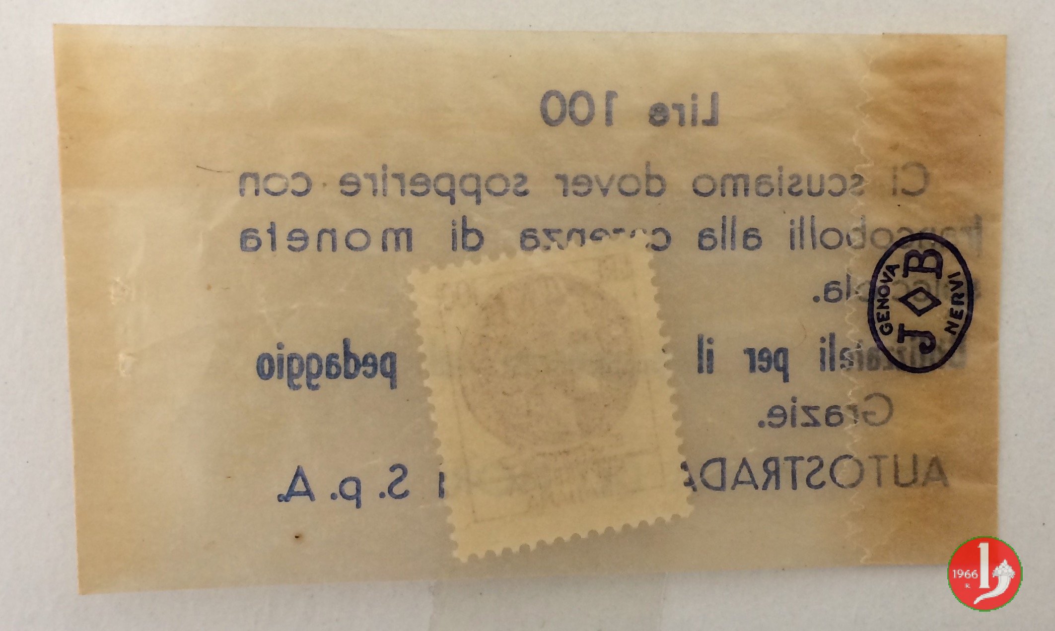 Verso: "Ci scusiamo dover sopperire con francobolli alla carenza di moneta spicciola. Utilizzateli per il pagamento del pedaggio. Grazie Autostrade S.p.a. LIRE 100"