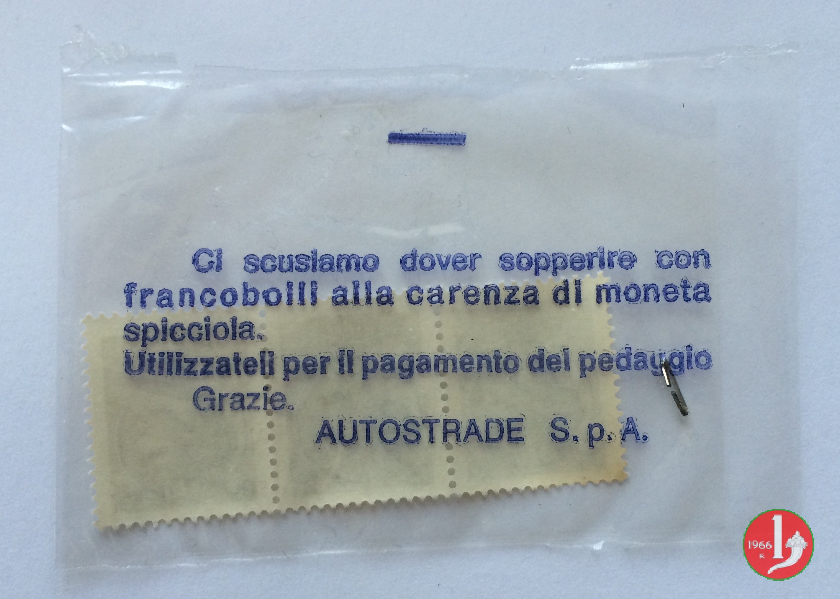 Verso: Al centro "Ci scusiamo dover sopperire con francobolli alla carenza di moneta spicciola. Utilizzateli per il pagamento del pedaggio. Grazie Autostrade S.p.a."
