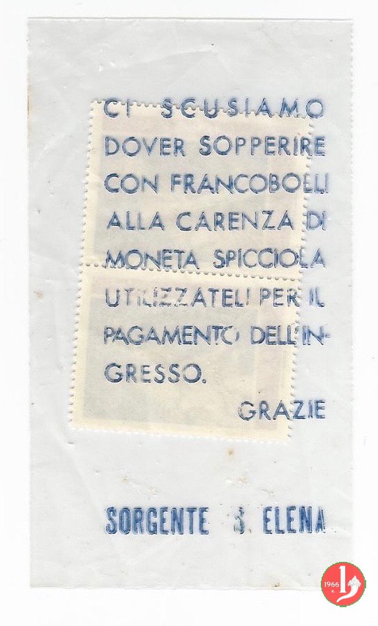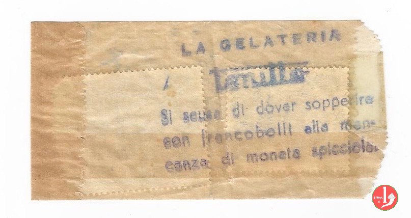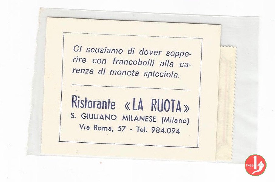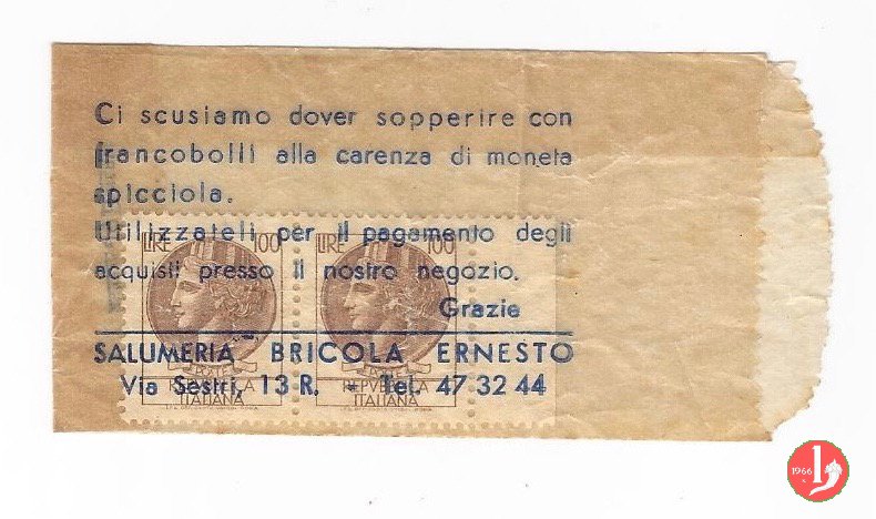 Verso: "Ci scusiamo dover sopperire con francobolli alla carenza di moneta spicciola. Grazie"