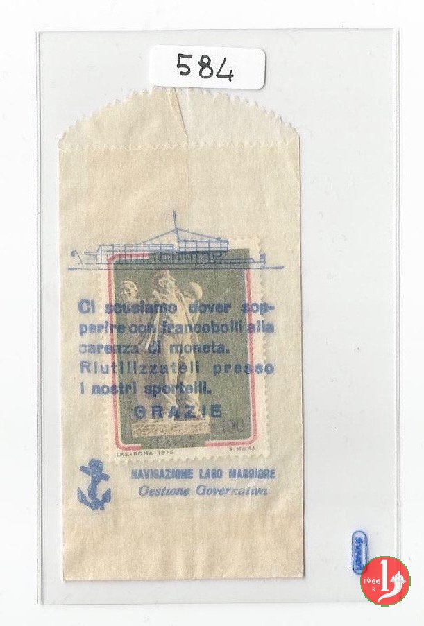 Verso: "Ci scusiamo dover sopperire con francobolli alla carenza di moneta. Riutilizzateli presso i nostri sportelli Grazie. Navigazione Lago Maggiore"