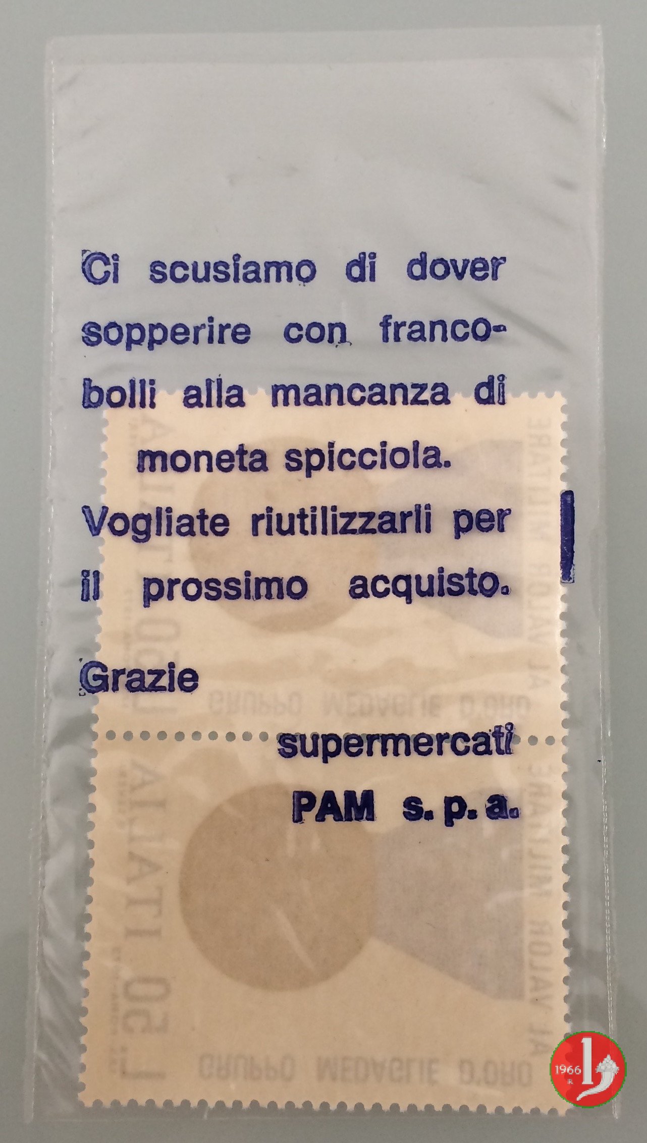 Verso: "Ci scusiamo di dover sopperire con francobolli alla mancanza di moneta spicciola. Vogliate riutilizzarli per il prossimo acquisto. Supermercati PAM"