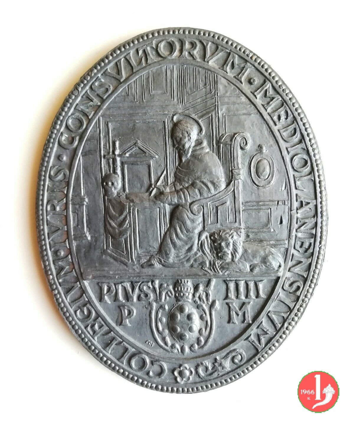 Collegio Mediolani Judicum Dritto: COLLEGIVM • IVRIS • COSNULTORVM • MEDIOLANENSIVM fregio e rosetta entro cornice ovale continua: in ambiente definito da cornici San Girolamo nimbato seduto verso sx a scrive con Croce e teschio, presso leone disteso in esergo, ai lati dello Stemma Papale tra volute e sormontato da triregno: PIVS _ IIII = P _ M in basso a sx: CDF | |