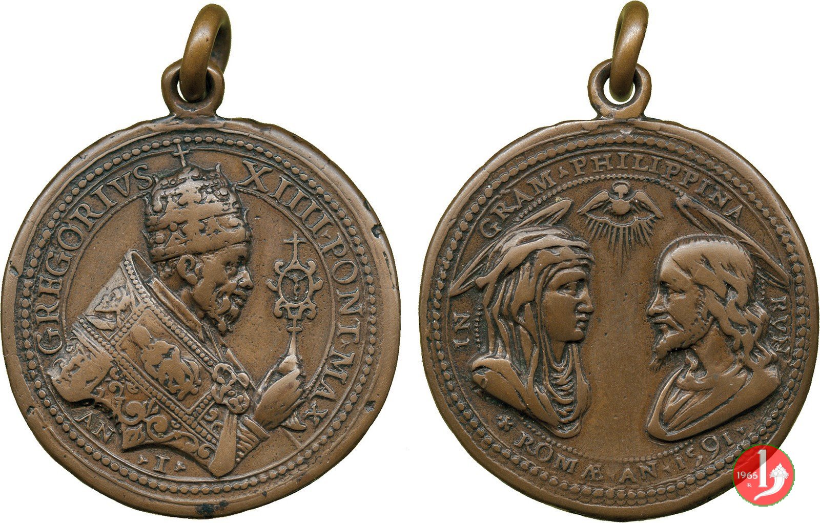 Missioni dei Gesuiti nelle Filippine -Mo922 Dritto: GREGORIVS _ XIIII • PONT • MAX busto a dx con triregno, piviale e ostensorio sotto: AN _ • I • busti affrontati e nimbati di Gesú Cristo e della B. V. Maria, irraggiati dalla colomba dello Spirito Santo, al centro, in alto sotto: * ROMA • AN • 1591 * | |